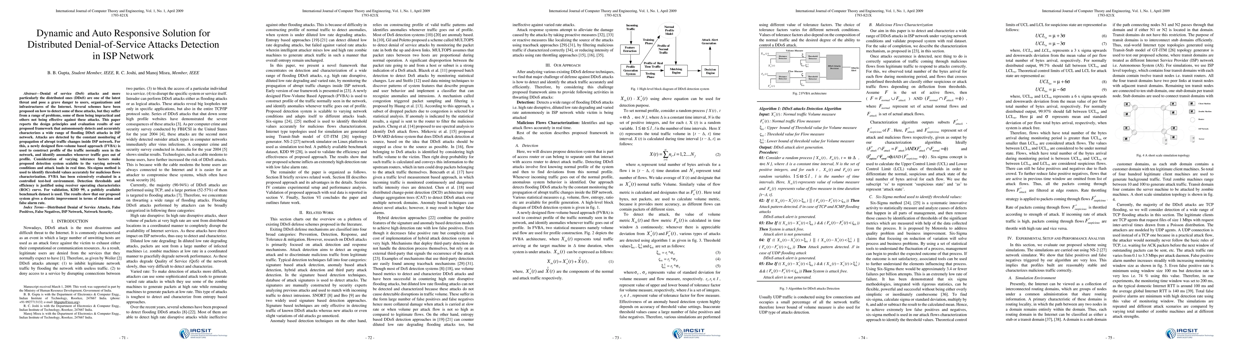 This paper proposes a dynamic and auto-responsive framework for detecting distributed denial-of-service (DDoS) attacks in ISP networks using a flow-volume based approach (FVBA) to monitor traffic anomalies. The system employs the six-sigma method to set accurate detection thresholds, demonstrating improved detection and reduced false alarm rates compared to existing methods.