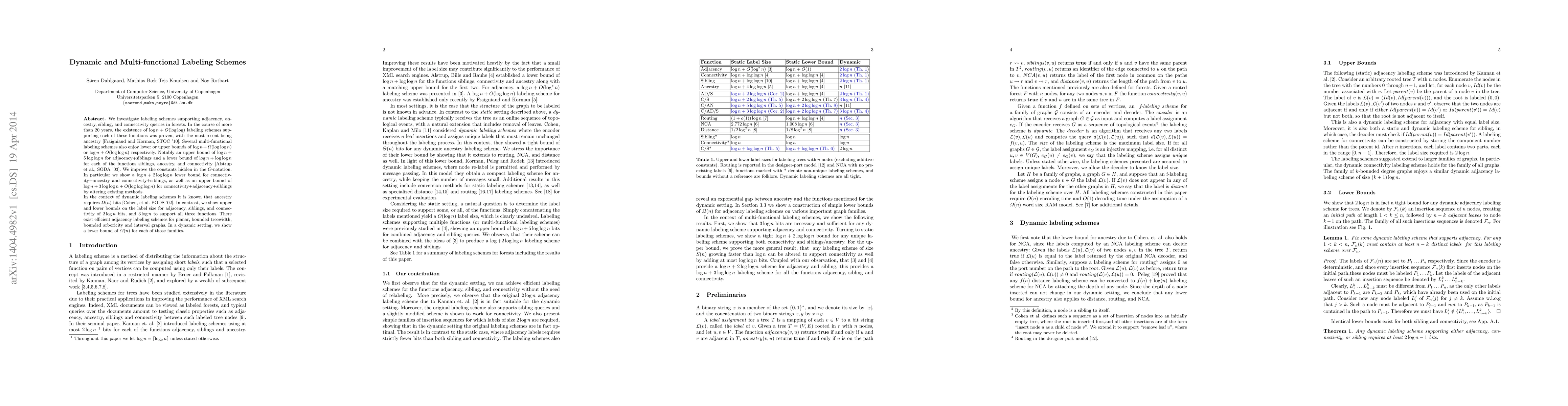 We investigate labeling schemes supporting adjacency, ancestry, sibling, and connectivity queries in forests. In the course of more than 20 years, the existence of $\log n + O(\log \log)$ labeling schemes supporting each of these functions was proven, with the most recent being ancestry [Fraigniaud and Korman, STOC '10]. Several multi-functional labeling schemes also enjoy lower or upper bounds of $\log n + \Omega(\log \log n)$ or $\log n + O(\log \log n)$ respectively. Notably an upper bound of $\log n + 5\log \log n$ for adjacency+siblings and a lower bound of $\log n + \log \log n$ for each of the functions siblings, ancestry, and connectivity [Alstrup et al., SODA '03]. We improve the constants hidden in the $O$-notation. In particular we show a $\log n + 2\log \log n$ lower bound for connectivity+ancestry and connectivity+siblings, as well as an upper bound of $\log n + 3\log \log n + O(\log \log \log n)$ for connectivity+adjacency+siblings by altering existing methods. In the context of dynamic labeling schemes it is known that ancestry requires $\Omega(n)$ bits [Cohen, et al. PODS '02]. In contrast, we show upper and lower bounds on the label size for adjacency, siblings, and connectivity of $2\log n$ bits, and $3 \log n$ to support all three functions. There exist efficient adjacency labeling schemes for planar, bounded treewidth, bounded arboricity and interval graphs. In a dynamic setting, we show a lower bound of $\Omega(n)$ for each of those families.