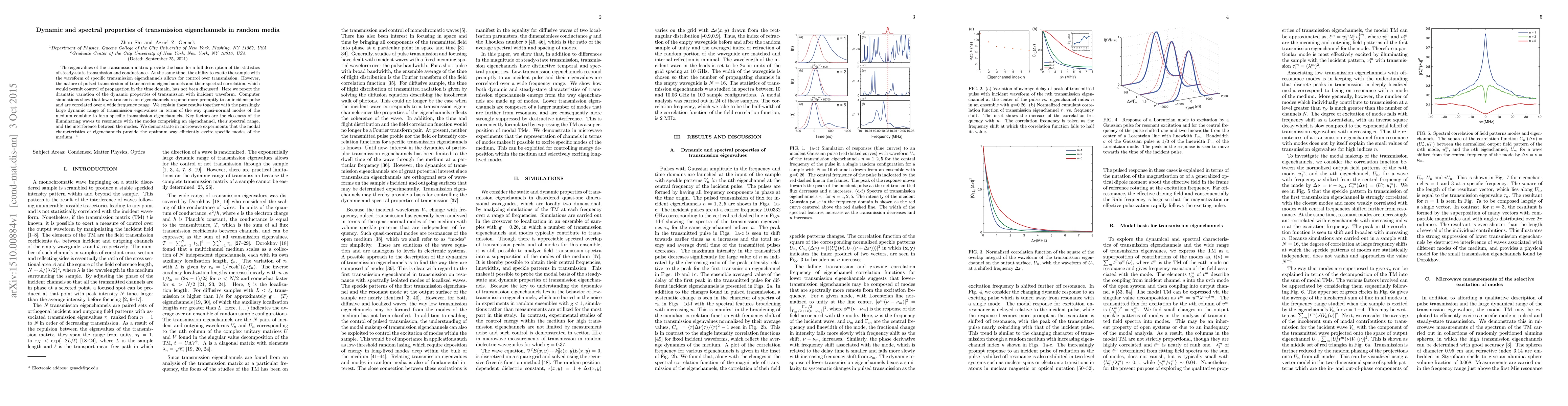 The eigenvalues of the transmission matrix provide the basis for a full description of the statistics of steady-state transmission and conductance. At the same time, the ability to excite the sample with the waveform of specific transmission eigenchannels allows for control over transmission. However, the nature of pulsed transmission of transmission eigenchannels and their spectral correlation, which would permit control of propagation in the time domain, has not been discussed. Here we report the dramatic variation of the dynamic properties of transmission with incident waveform. Computer simulations show that lower-transmission eigenchannels respond more promptly to an incident pulse and are correlated over a wide frequency range. We explain these results together with the puzzlingly large dynamic range of transmission eigenvalues in terms of the way quasi-normal modes of the medium combine to form specific transmission eigenchannels. Key factors are the closeness of the illuminating waves to resonance with the modes comprising an eigenchannel, their spectral range, and the interference between the modes. We demonstrate in microwave experiments that the modal characteristics of eigenchannels provide the optimum way efficiently excite specific modes of the medium.