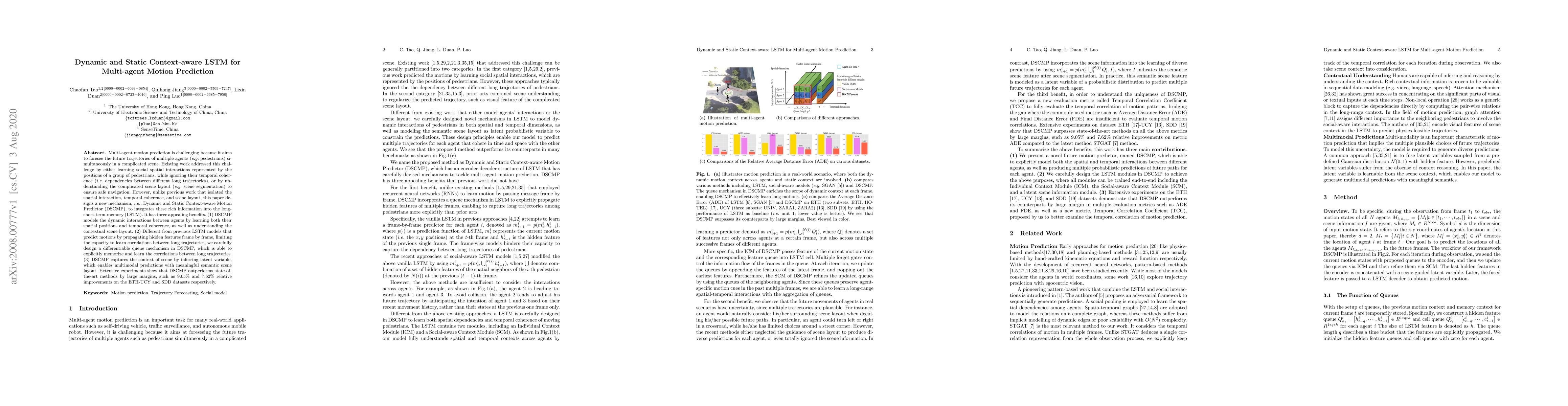 Multi-agent motion prediction is challenging because it aims to foresee the future trajectories of multiple agents (\textit{e.g.} pedestrians) simultaneously in a complicated scene. Existing work addressed this challenge by either learning social spatial interactions represented by the positions of a group of pedestrians, while ignoring their temporal coherence (\textit{i.e.} dependencies between different long trajectories), or by understanding the complicated scene layout (\textit{e.g.} scene segmentation) to ensure safe navigation. However, unlike previous work that isolated the spatial interaction, temporal coherence, and scene layout, this paper designs a new mechanism, \textit{i.e.}, Dynamic and Static Context-aware Motion Predictor (DSCMP), to integrates these rich information into the long-short-term-memory (LSTM). It has three appealing benefits. (1) DSCMP models the dynamic interactions between agents by learning both their spatial positions and temporal coherence, as well as understanding the contextual scene layout.(2) Different from previous LSTM models that predict motions by propagating hidden features frame by frame, limiting the capacity to learn correlations between long trajectories, we carefully design a differentiable queue mechanism in DSCMP, which is able to explicitly memorize and learn the correlations between long trajectories. (3) DSCMP captures the context of scene by inferring latent variable, which enables multimodal predictions with meaningful semantic scene layout. Extensive experiments show that DSCMP outperforms state-of-the-art methods by large margins, such as 9.05\% and 7.62\% relative improvements on the ETH-UCY and SDD datasets respectively.