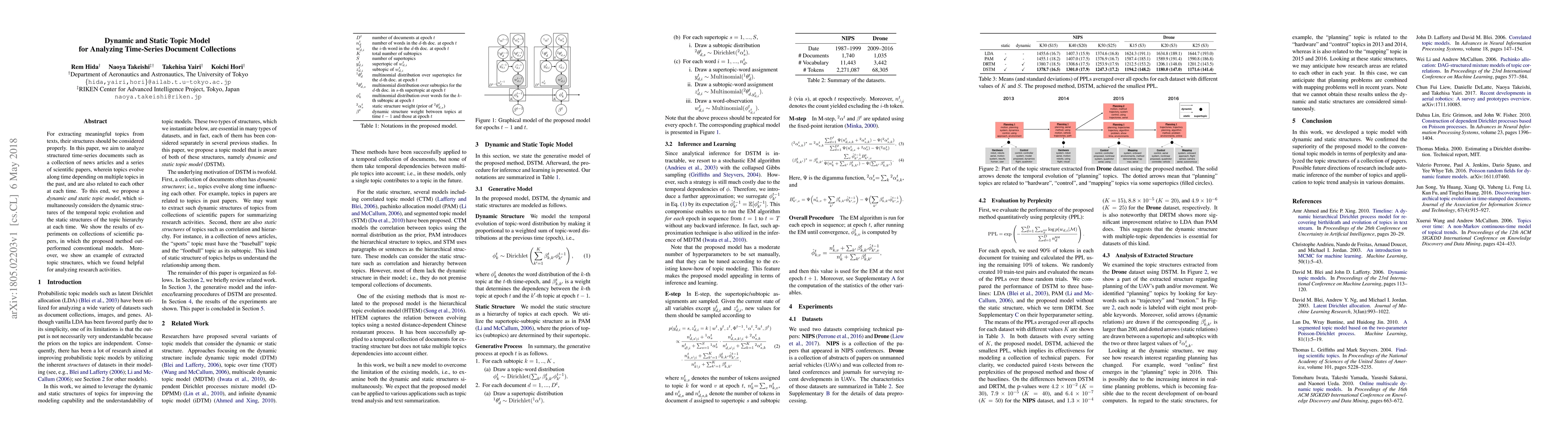 This paper proposes a dynamic and static topic model to analyze time-series document collections, capturing both temporal topic evolution and static topic hierarchies. Experiments on scientific papers demonstrate its superior performance over conventional models and reveal useful insights into research activities.
