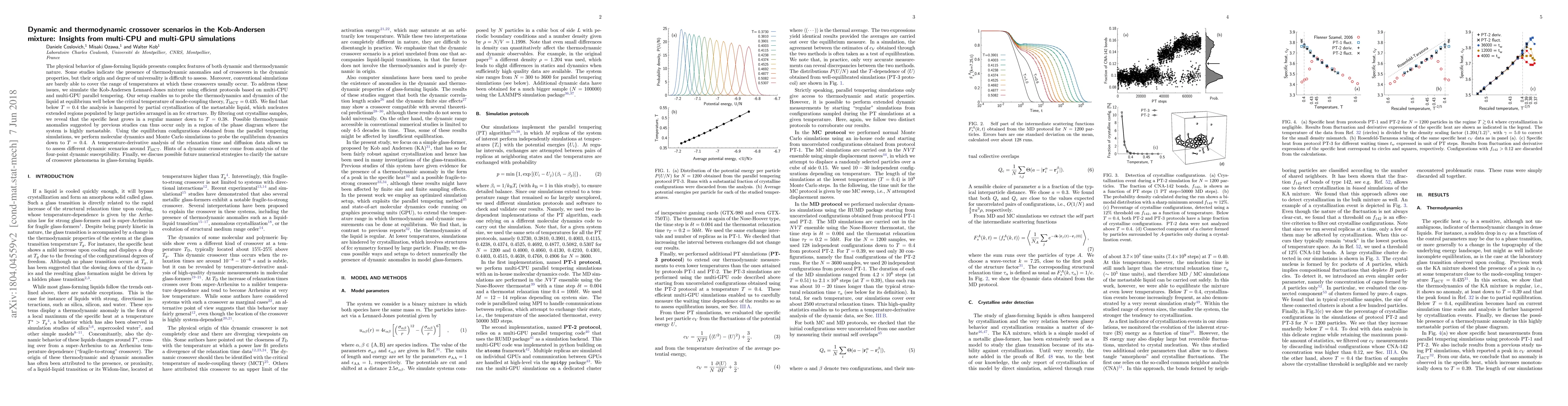 The physical behavior of glass-forming liquids presents complex features of both dynamic and thermodynamic nature. Some studies indicate the presence of thermodynamic anomalies and of crossovers in the dynamic properties, but their origin and degree of universality is difficult to assess. Moreover, conventional simulations are barely able to cover the range of temperatures at which these crossovers usually occur. To address these issues, we simulate the Kob-Andersen Lennard-Jones mixture using efficient protocols based on multi-CPU and multi-GPU parallel tempering. Our setup enables us to probe the thermodynamics and dynamics of the liquid at equilibrium well below the critical temperature of mode-coupling theory, $T_{\rm MCT} = 0.435$. We find that below $T=0.4$ the analysis is hampered by partial crystallization of the metastable liquid, which nucleates extended regions populated by large particles arranged in an fcc structure. By filtering out crystalline samples, we reveal that the specific heat grows in a regular manner down to $T=0.38$. Possible thermodynamic anomalies suggested by previous studies can thus occur only in a region of the phase diagram where the system is highly metastable. Using the equilibrium configurations obtained from the parallel tempering simulations, we perform molecular dynamics and Monte Carlo simulations to probe the equilibrium dynamics down to $T=0.4$. A temperature-derivative analysis of the relaxation time and diffusion data allows us to assess different dynamic scenarios around $T_{\rm MCT}$. Hints of a dynamic crossover come from analysis of the four-point dynamic susceptibility. Finally, we discuss possible future numerical strategies to clarify the nature of crossover phenomena in glass-forming liquids.