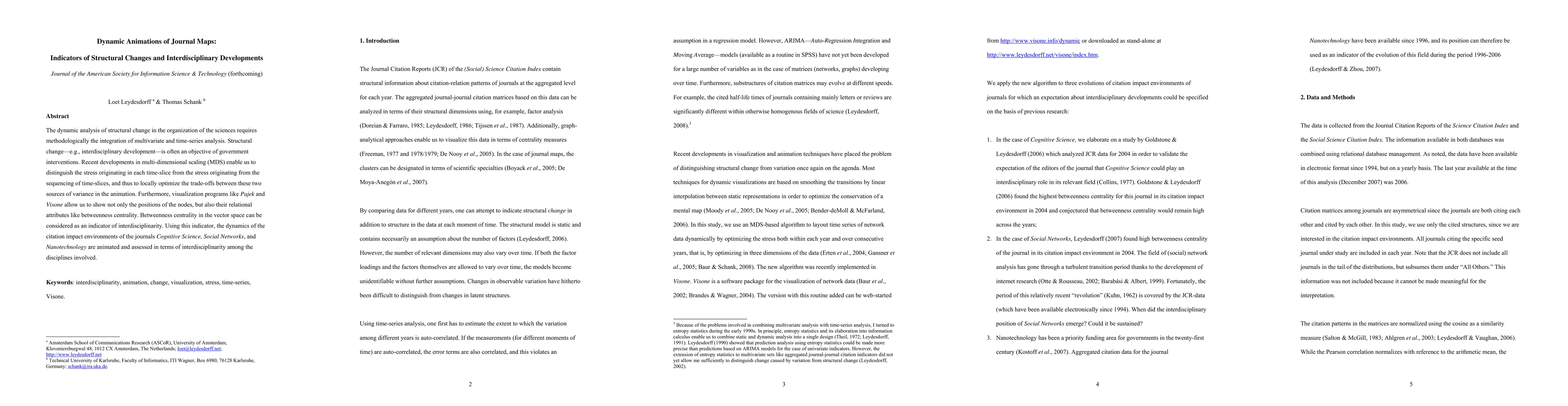The dynamic analysis of structural change in the organization of the sciences requires methodologically the integration of multivariate and time-series analysis. Structural change--e.g., interdisciplinary development--is often an objective of government interventions. Recent developments in multi-dimensional scaling (MDS) enable us to distinguish the stress originating in each time-slice from the stress originating from the sequencing of time-slices, and thus to locally optimize the trade-offs between these two sources of variance in the animation. Furthermore, visualization programs like Pajek and Visone allow us to show not only the positions of the nodes, but also their relational attributes like betweenness centrality. Betweenness centrality in the vector space can be considered as an indicator of interdisciplinarity. Using this indicator, the dynamics of the citation impact environments of the journals Cognitive Science, Social Networks, and Nanotechnology are animated and assessed in terms of interdisciplinarity among the disciplines involved.