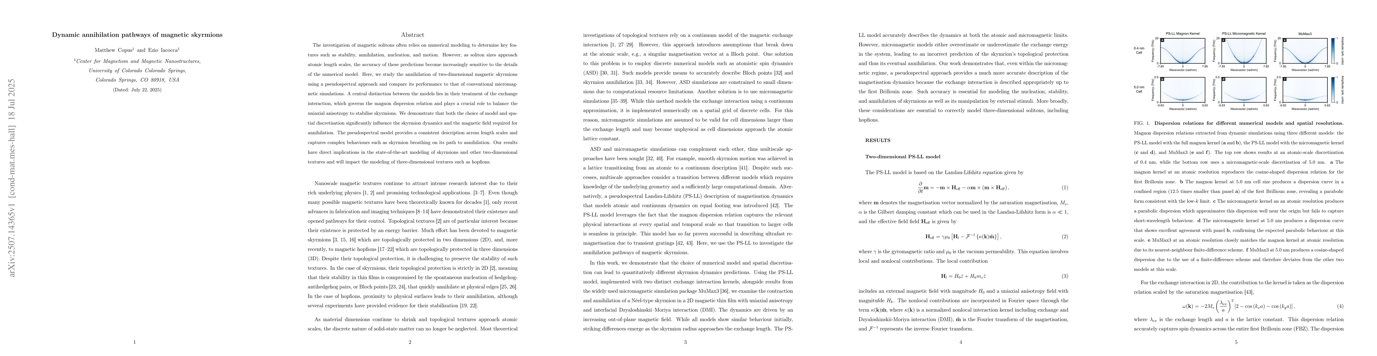 The investigation of magnetic solitons often relies on numerical modeling to determine key features such as stability, annihilation, nucleation, and motion. However, as soliton sizes approach atomic length scales, the accuracy of these predictions become increasingly sensitive to the details of the numerical model. Here, we study the annihilation of two-dimensional magnetic skyrmions using a pseudospectral approach and compare its performance to that of conventional micromagnetic simulations. A central distinction between the models lies in their treatment of the exchange interaction, which governs the magnon dispersion relation and plays a crucial role to balance the uniaxial anisotropy to stabilise skyrmions. We demonstrate that both the choice of model and spatial discretisation significantly influence the skyrmion dynamics and the magnetic field required for annihilation. The pseudospectral model provides a consistent description across length scales and captures complex behaviours such as skyrmion breathing on its path to annihilation. Our results have direct implications in the state-of-the-art modeling of skyrmions and other two-dimensional textures and will impact the modeling of three-dimensional textures such as hopfions.