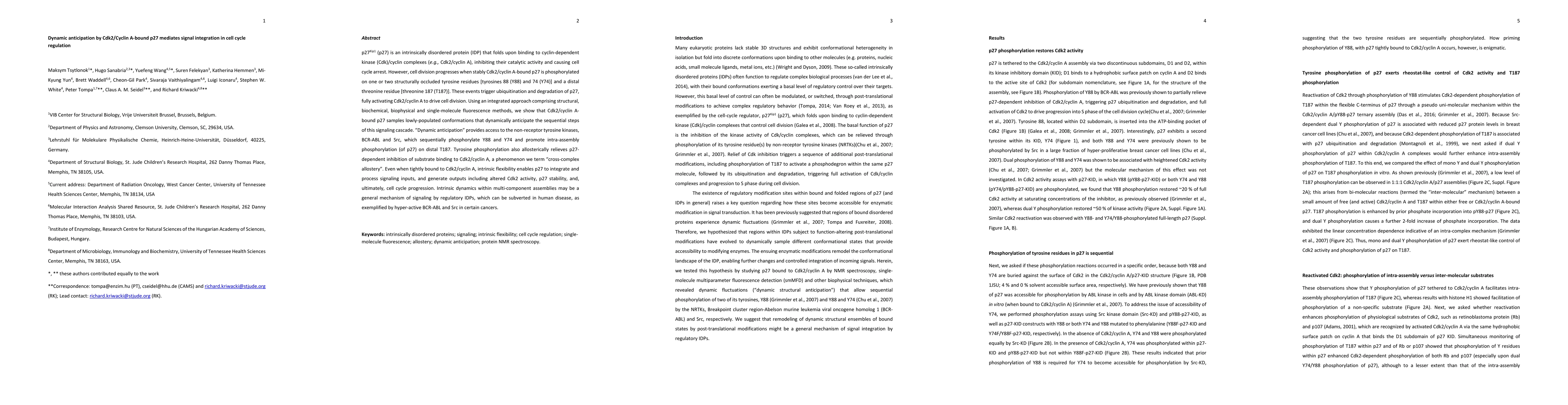This study reveals how the flexible protein p27 dynamically anticipates and responds to signaling events within cell cycle regulation by sampling different shapes, enabling it to control cell division processes. These insights highlight how intrinsic protein flexibility can integrate signals and influence cell growth, with implications for understanding certain cancers.