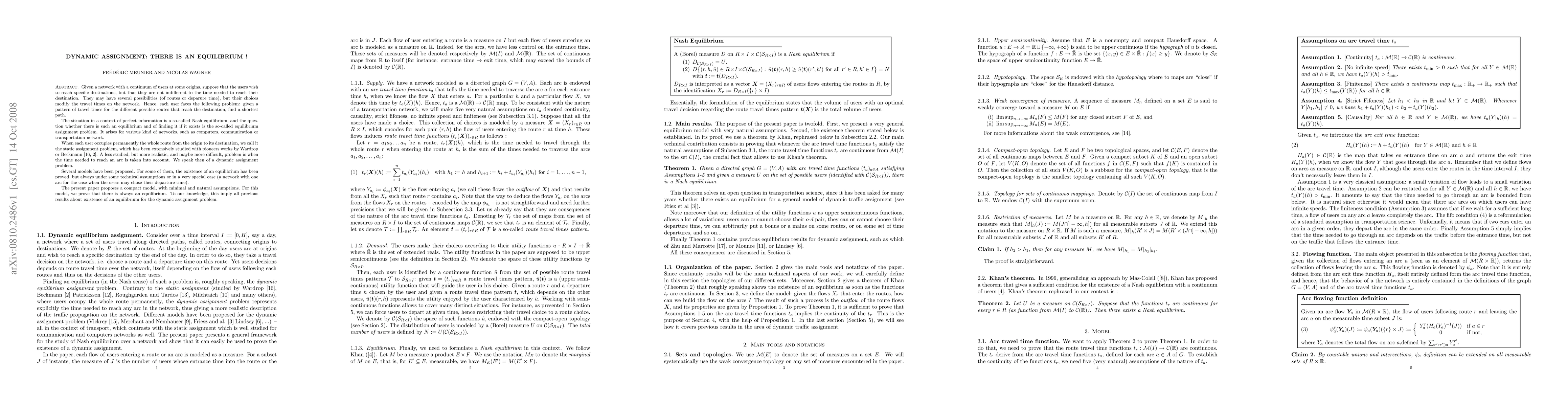 Researchers have proven that there is always a Nash equilibrium in dynamic assignment problems, where users choose routes based on travel time, even with minimal assumptions. This finding implies that previous results about existence of an equilibrium for similar problems were limited to specific cases or technical assumptions.