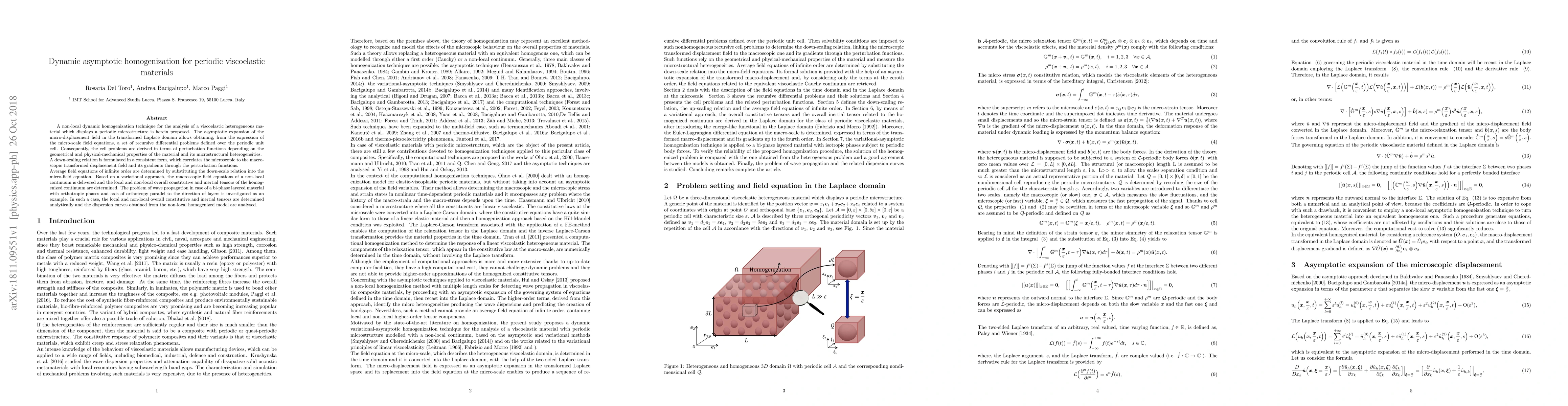 This research introduces a dynamic homogenization method for analyzing viscoelastic materials with periodic microstructures. It derives recursive differential problems and a down-scaling relation, leading to macroscopic field equations of infinite order. The approach is exemplified by investigating wave propagation in a bi-phase layered material, determining local and non-local constitutive and inertial tensors.