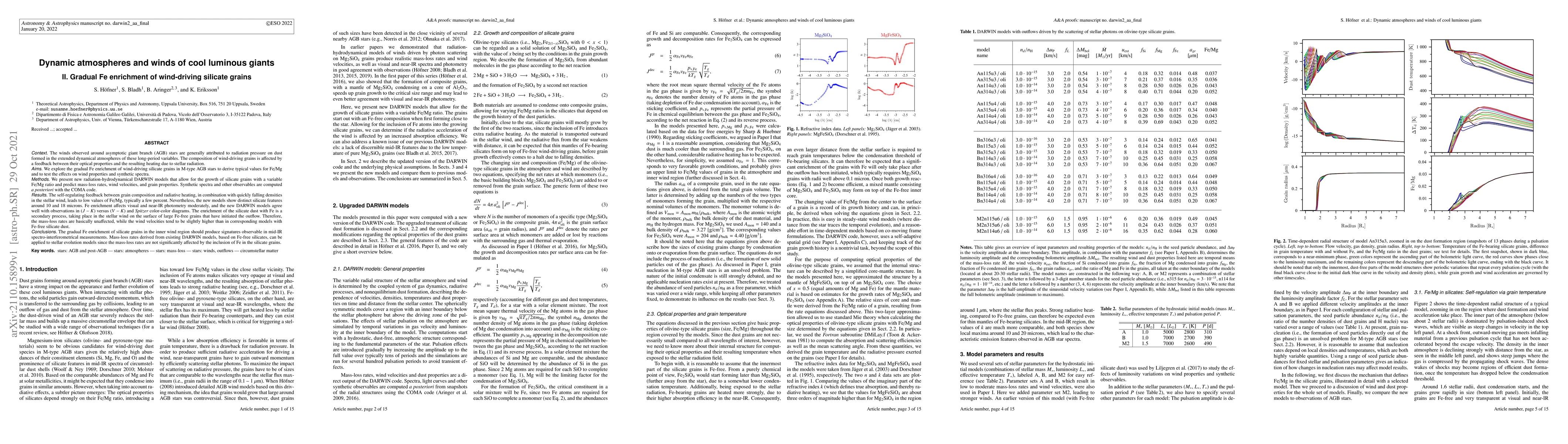 The winds observed around AGB stars are generally attributed to radiation pressure on dust formed in the dynamical atmospheres of these long-period variables. The composition of wind-driving grains is affected by a feedback between their optical properties and the resulting heating due to stellar radiation. We explore the gradual Fe enrichment of wind-driving silicate grains in M-type AGB stars to derive typical values for Fe/Mg and test the effects on wind properties and synthetic spectra. We present new DARWIN models that allow for the growth of silicate grains with a variable Fe/Mg ratio and predict mass-loss rates, wind velocities, and grain properties. Synthetic spectra and other observables are computed with the COMA code. The self-regulating feedback between grain composition and radiative heating, in combination with quickly falling densities in the stellar wind, leads to low values of Fe/Mg, typically a few percent. Nevertheless, the models show distinct silicate features around 10 and 18 microns. Fe enrichment affects visual and near-IR photometry moderately, and the new DARWIN models agree well with observations in (J-K) vs. (V-K) and Spitzer color-color diagrams. The enrichment of the silicate dust with Fe is a secondary process, taking place in the stellar wind on the surface of large Fe-free grains that have initiated the outflow. Therefore, the mass-loss rates are basically unaffected, while the wind velocities tend to be slightly higher than in corresponding models with Fe-free silicate dust. The gradual Fe enrichment of silicate grains in the inner wind region should produce signatures observable in mid-IR spectro-interferometrical measurements. Mass-loss rates derived from existing DARWIN models, based on Fe-free silicates, can be applied to stellar evolution models since the mass-loss rates are not significantly affected by the inclusion of Fe in the silicate grains.