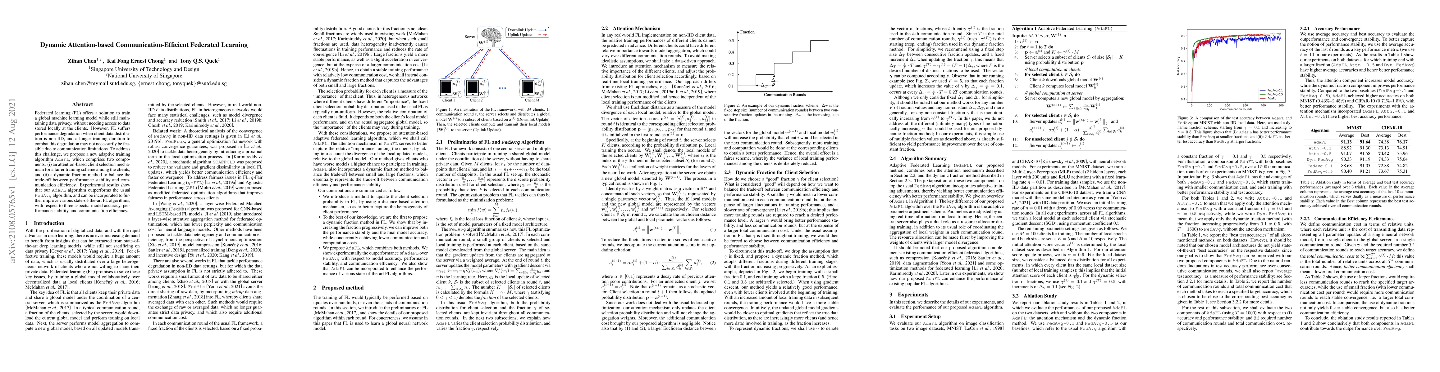 A new federated learning algorithm called AdaFL improves model accuracy, performance stability, and communication efficiency by using an attention-based client selection mechanism and a dynamic fraction method.