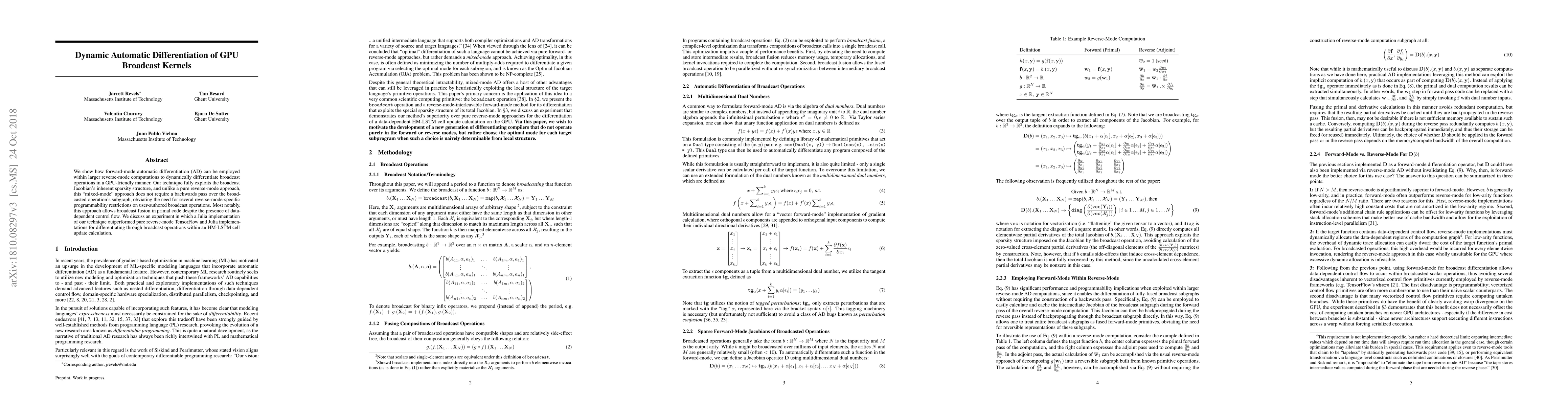 This paper presents a dynamic automatic differentiation technique for GPU broadcast kernels that combines forward-mode AD with reverse-mode computations, exploiting the sparsity of the broadcast Jacobian. This "mixed-mode" approach avoids the need for reverse-mode restrictions and outperforms pure reverse-mode methods in differentiating broadcast operations, as demonstrated in an HM-LSTM cell update calculation.