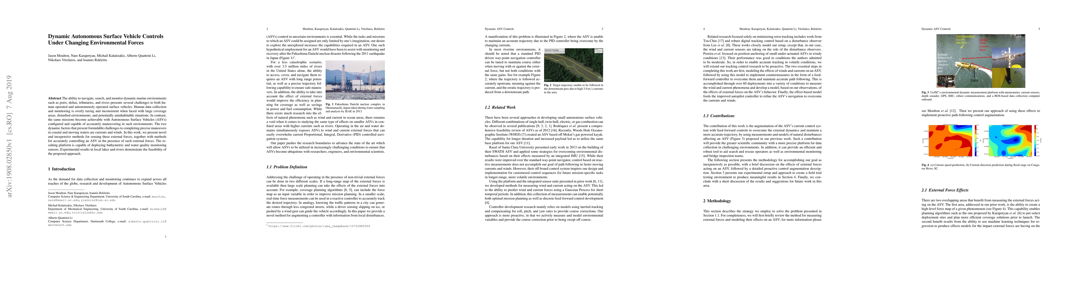 The ability to navigate, search, and monitor dynamic marine environments such as ports, deltas, tributaries, and rivers presents several challenges to both human operated and autonomously operated surface vehicles. Human data collection and monitoring is overly taxing and inconsistent when faced with large coverage areas, disturbed environments, and potentially uninhabitable situations. In contrast,the same missions become achievable with Autonomous Surface Vehicles (ASVs)configured and capable of accurately maneuvering in such environments. The two dynamic factors that present formidable challenges to completing precise maneuvers in coastal and moving waters are currents and winds. In this work, we present novel and inexpensive methods for sensing these external forces, together with methods for accurately controlling an ASV in the presence of such external forces. The resulting platform is capable of deploying bathymetric and water quality monitoring sensors. Experimental results in local lakes and rivers demonstrate the feasibility of the proposed approach.