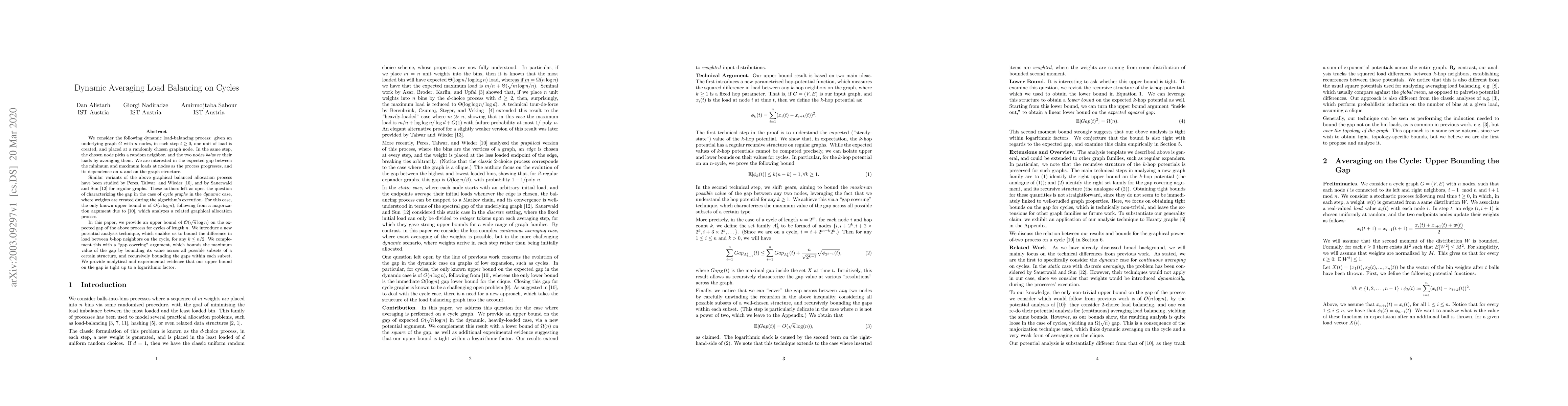 We consider the following dynamic load-balancing process: given an underlying graph $G$ with $n$ nodes, in each step $t\geq 0$, one unit of load is created, and placed at a randomly chosen graph node. In the same step, the chosen node picks a random neighbor, and the two nodes balance their loads by averaging them. We are interested in the expected gap between the minimum and maximum loads at nodes as the process progresses, and its dependence on $n$ and on the graph structure. Similar variants of the above graphical balanced allocation process have been studied by Peres, Talwar, and Wieder, and by Sauerwald and Sun for regular graphs. These authors left as open the question of characterizing the gap in the case of \emph{cycle graphs} in the \emph{dynamic} case, where weights are created during the algorithm's execution. For this case, the only known upper bound is of $\mathcal{O}( n \log n )$, following from a majorization argument due to Peres, Talwar, and Wieder, which analyzes a related graphical allocation process. In this paper, we provide an upper bound of $\mathcal{O} ( \sqrt n \log n )$ on the expected gap of the above process for cycles of length $n$. We introduce a new potential analysis technique, which enables us to bound the difference in load between $k$-hop neighbors on the cycle, for any $k \leq n / 2$. We complement this with a "gap covering" argument, which bounds the maximum value of the gap by bounding its value across all possible subsets of a certain structure, and recursively bounding the gaps within each subset. We provide analytical and experimental evidence that our upper bound on the gap is tight up to a logarithmic factor.