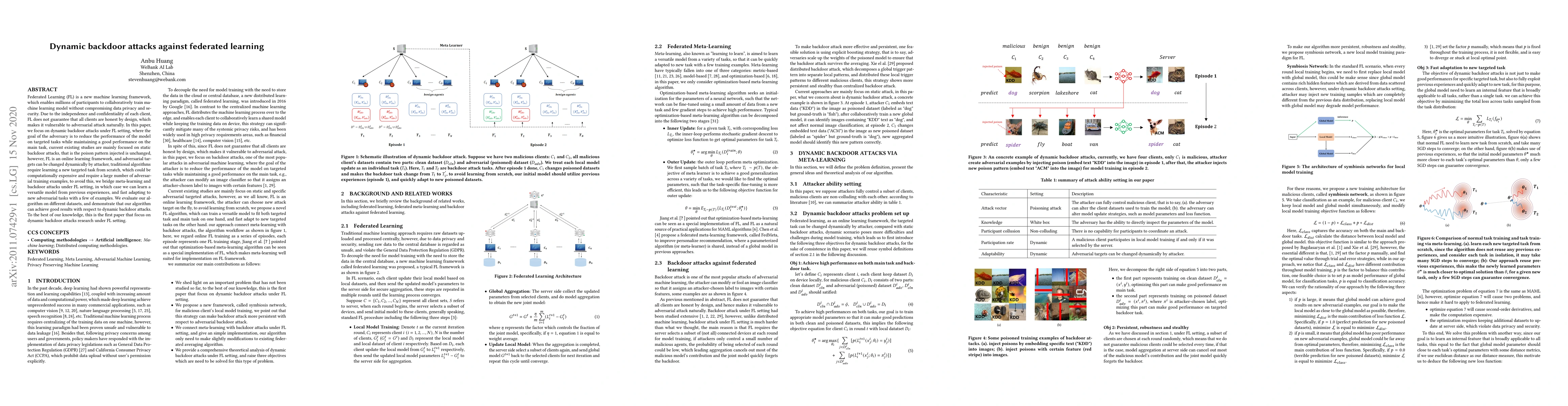 Federated Learning (FL) is a new machine learning framework, which enables millions of participants to collaboratively train machine learning model without compromising data privacy and security. Due to the independence and confidentiality of each client, FL does not guarantee that all clients are honest by design, which makes it vulnerable to adversarial attack naturally. In this paper, we focus on dynamic backdoor attacks under FL setting, where the goal of the adversary is to reduce the performance of the model on targeted tasks while maintaining a good performance on the main task, current existing studies are mainly focused on static backdoor attacks, that is the poison pattern injected is unchanged, however, FL is an online learning framework, and adversarial targets can be changed dynamically by attacker, traditional algorithms require learning a new targeted task from scratch, which could be computationally expensive and require a large number of adversarial training examples, to avoid this, we bridge meta-learning and backdoor attacks under FL setting, in which case we can learn a versatile model from previous experiences, and fast adapting to new adversarial tasks with a few of examples. We evaluate our algorithm on different datasets, and demonstrate that our algorithm can achieve good results with respect to dynamic backdoor attacks. To the best of our knowledge, this is the first paper that focus on dynamic backdoor attacks research under FL setting.
