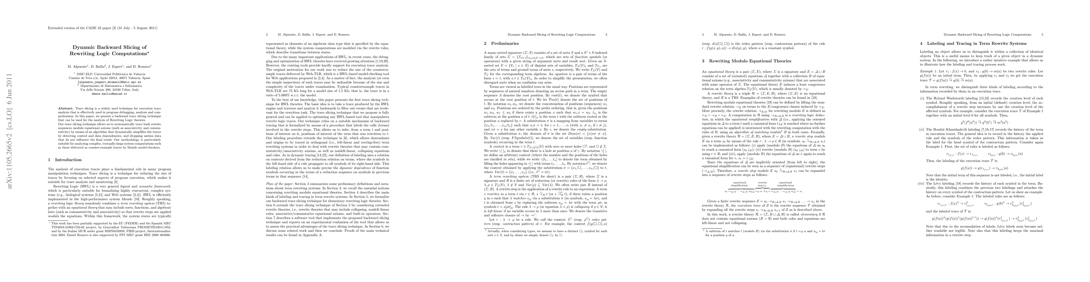 Trace slicing is a widely used technique for execution trace analysis that is effectively used in program debugging, analysis and comprehension. In this paper, we present a backward trace slicing technique that can be used for the analysis of Rewriting Logic theories. Our trace slicing technique allows us to systematically trace back rewrite sequences modulo equational axioms (such as associativity and commutativity) by means of an algorithm that dynamically simplifies the traces by detecting control and data dependencies, and dropping useless data that do not influence the final result. Our methodology is particularly suitable for analyzing complex, textually-large system computations such as those delivered as counter-example traces by Maude model-checkers.
