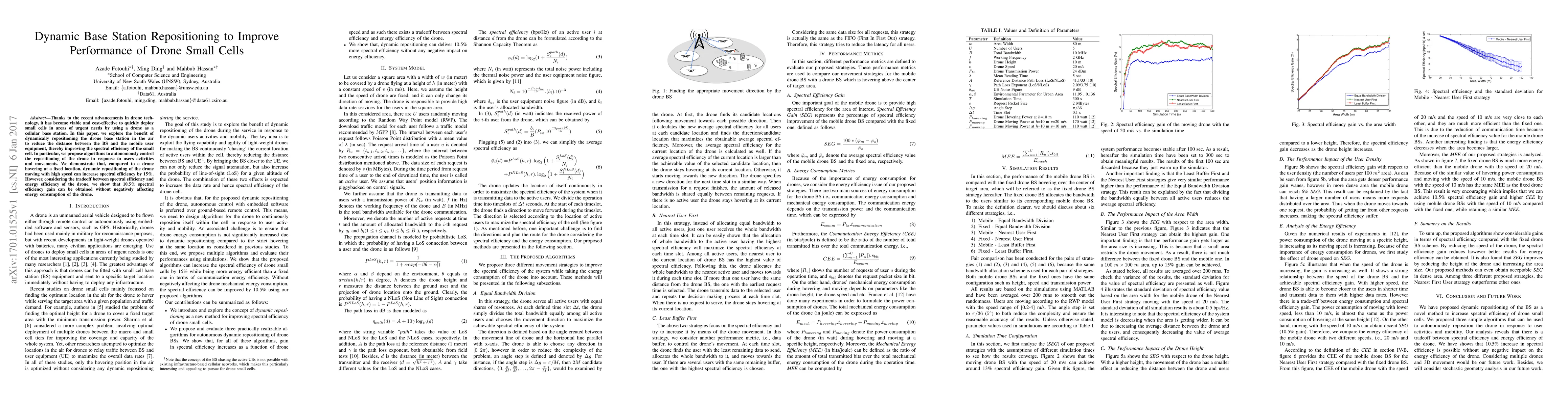 A novel algorithm for dynamic repositioning of BSs was proposed to increase spectralefficiency of dronesmallcells.