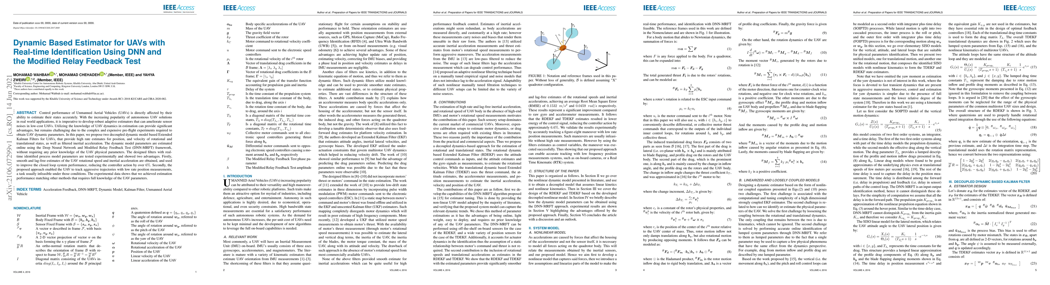 This paper presents a novel Dynamic Based Estimator for UAVs using Deep Neural Network and Modified Relay Feedback Test (DNN-MRFT) for real-time identification of dynamic model parameters. The method eliminates the need for prior UAV parameter knowledge, providing smooth estimates for rotational speed and inertial acceleration, improving controller performance by 6%, and enabling agile trajectory tracking with low rate position measurements. Experimental results match performance of methods requiring full UAV parameter knowledge.