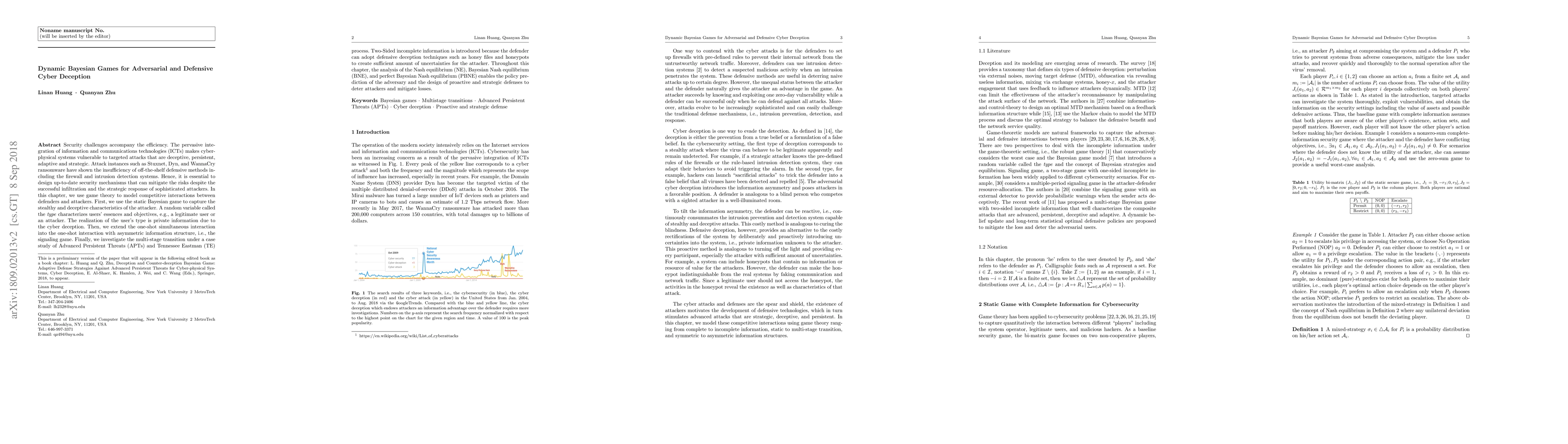 Security challenges accompany the efficiency. The pervasive integration of information and communications technologies (ICTs) makes cyber-physical systems vulnerable to targeted attacks that are deceptive, persistent, adaptive and strategic. Attack instances such as Stuxnet, Dyn, and WannaCry ransomware have shown the insufficiency of off-the-shelf defensive methods including the firewall and intrusion detection systems. Hence, it is essential to design up-to-date security mechanisms that can mitigate the risks despite the successful infiltration and the strategic response of sophisticated attackers. In this chapter, we use game theory to model competitive interactions between defenders and attackers. First, we use the static Bayesian game to capture the stealthy and deceptive characteristics of the attacker. A random variable called the \textit{type} characterizes users' essences and objectives, e.g., a legitimate user or an attacker. The realization of the user's type is private information due to the cyber deception. Then, we extend the one-shot simultaneous interaction into the one-shot interaction with asymmetric information structure, i.e., the signaling game. Finally, we investigate the multi-stage transition under a case study of Advanced Persistent Threats (APTs) and Tennessee Eastman (TE) process. Two-Sided incomplete information is introduced because the defender can adopt defensive deception techniques such as honey files and honeypots to create sufficient amount of uncertainties for the attacker. Throughout this chapter, the analysis of the Nash equilibrium (NE), Bayesian Nash equilibrium (BNE), and perfect Bayesian Nash equilibrium (PBNE) enables the policy prediction of the adversary and the design of proactive and strategic defenses to deter attackers and mitigate losses.