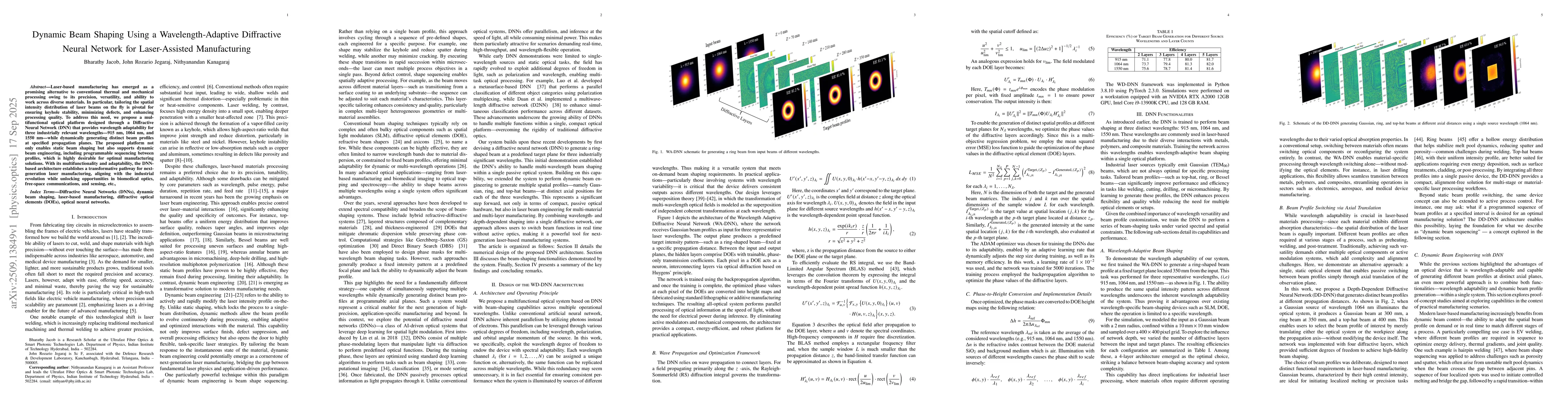 The research employs a Wavelength-Adaptive Diffractive Neural Network (WA-DNN) to dynamically shape laser beams across three wavelengths (915 nm, 1064 nm, 1550 nm). The network uses wave propagation models and backpropagation for training, with phase-to-height conversion for fabrication.