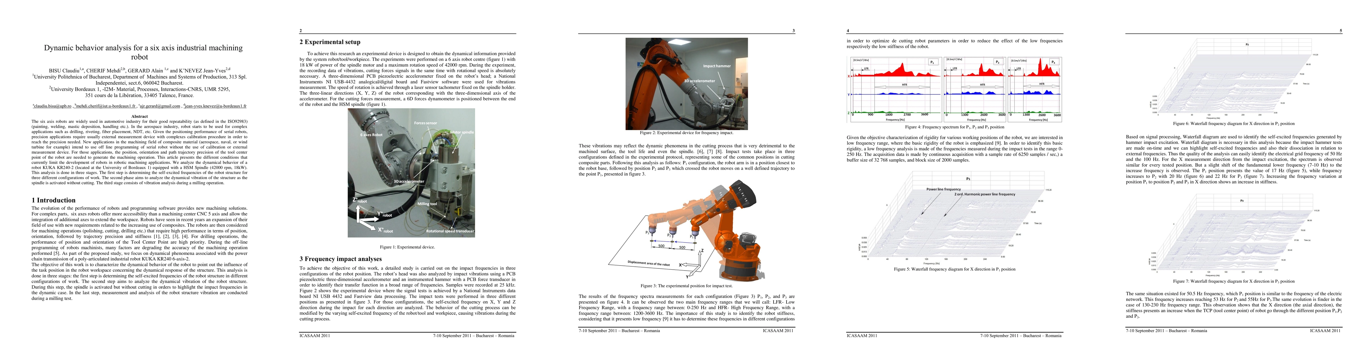 The six axis robots are widely used in automotive industry for their good repeatability (as defined in the ISO92983) (painting, welding, mastic deposition, handling etc.). In the aerospace industry, robot starts to be used for complex applications such as drilling, riveting, fiber placement, NDT, etc. Given the positioning performance of serial robots, precision applications require usually external measurement device with complexes calibration procedure in order to reach the precision needed. New applications in the machining field of composite material (aerospace, naval, or wind turbine for example) intend to use off line programming of serial robot without the use of calibration or external measurement device. For those applications, the position, orientation and path trajectory precision of the tool center point of the robot are needed to generate the machining operation. This article presents the different conditions that currently limit the development of robots in robotic machining applications. We analyze the dynamical behavior of a robot KUKA KR240-2 (located at the University of Bordeaux 1) equipped with a HSM Spindle (42000 rpm, 18kW). This analysis is done in three stages. The first step is determining the self-excited frequencies of the robot structure for three different configurations of work. The second phase aims to analyze the dynamical vibration of the structure as the spindle is activated without cutting. The third stage consists of vibration analysis during a milling operation.