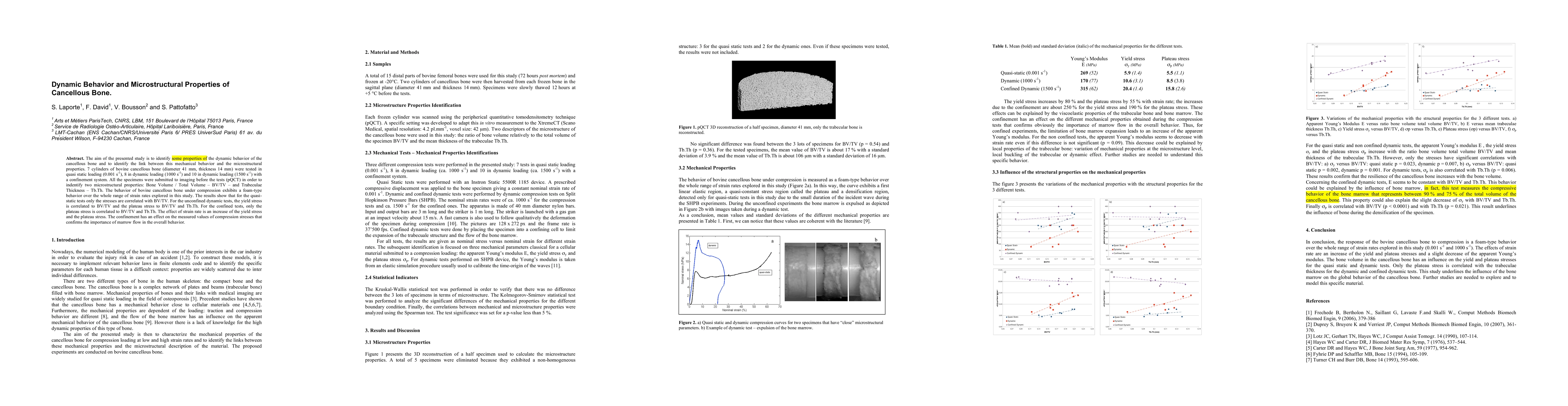 This study investigates the dynamic behavior of bovine cancellous bone under various loading conditions and correlates it with microstructural properties. The results show that mechanical behavior is linked to bone volume and trabeculae thickness, with stress increasing with strain rate and confinement affecting compression stresses.