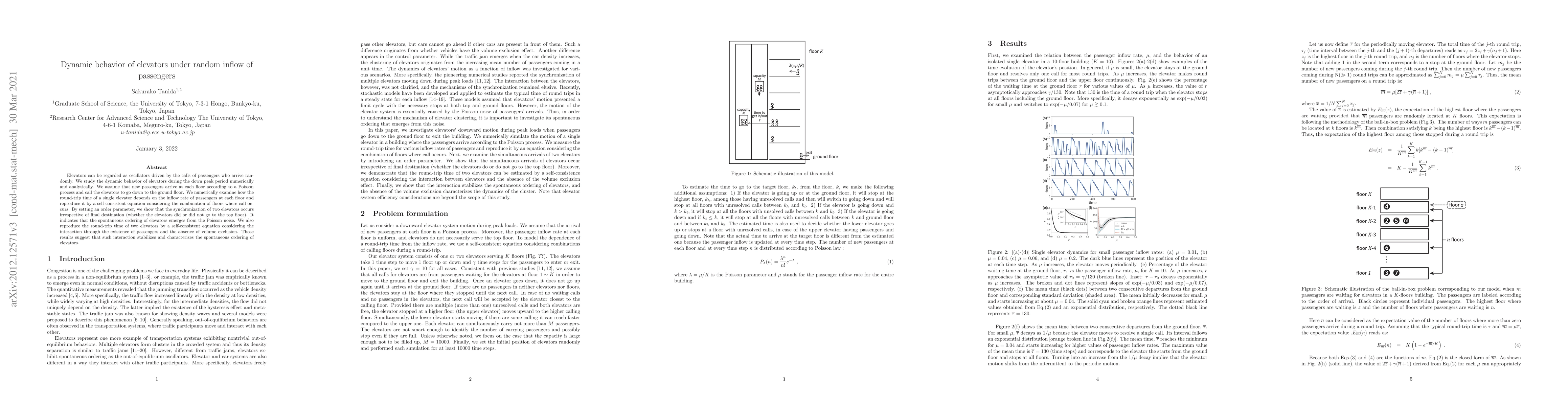 Elevator behavior is studied under random passenger arrivals, showing synchronized movement among elevators with varying inflow rates. This synchronization emerges from Poisson noise, indicating a spontaneous ordering of elevators driven by passenger interactions.