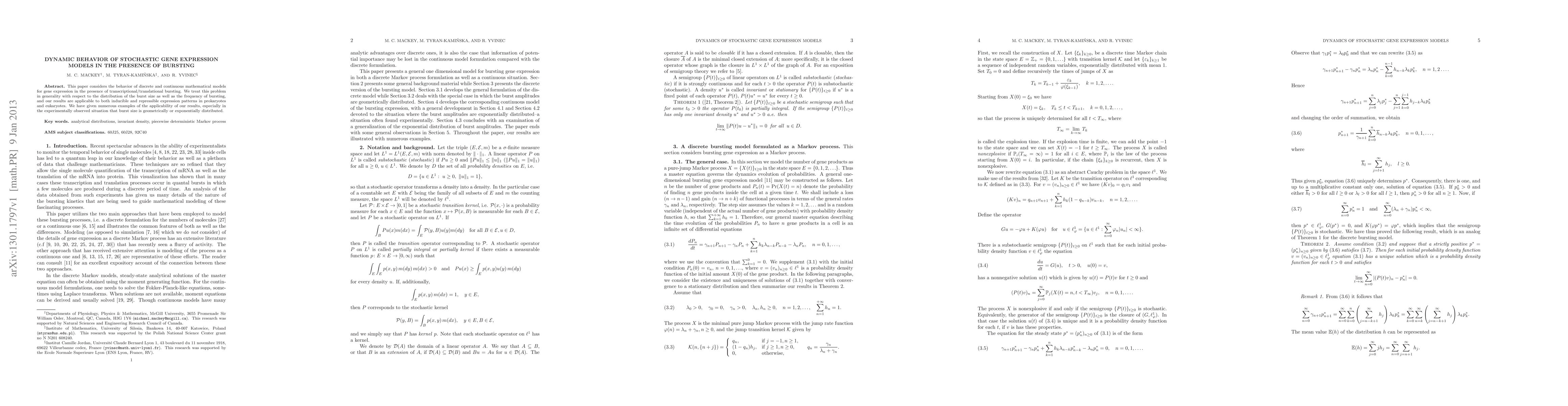 This paper investigates the dynamic behavior of gene expression models under transcriptional/translational bursting, considering both discrete and continuous approaches. The study's generality covers various burst size distributions and frequencies, applicable to both inducible and repressible patterns in prokaryotes and eukaryotes, with a focus on geometrically or exponentially distributed burst sizes.