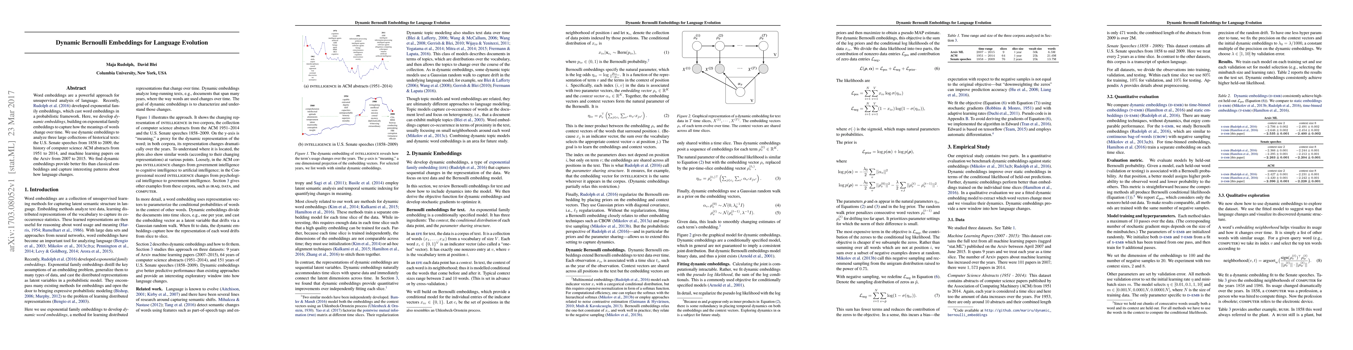 The paper introduces dynamic Bernoulli embeddings for language evolution, building on exponential family embeddings. It uses a Gaussian random walk prior to capture how the meanings of words change over time. The method is applied to three large historical text datasets: U.S. Senate speeches (1858-2009), ACM computer science abstracts (1951-2014), and machine learning papers on Arxiv (2007-2015).