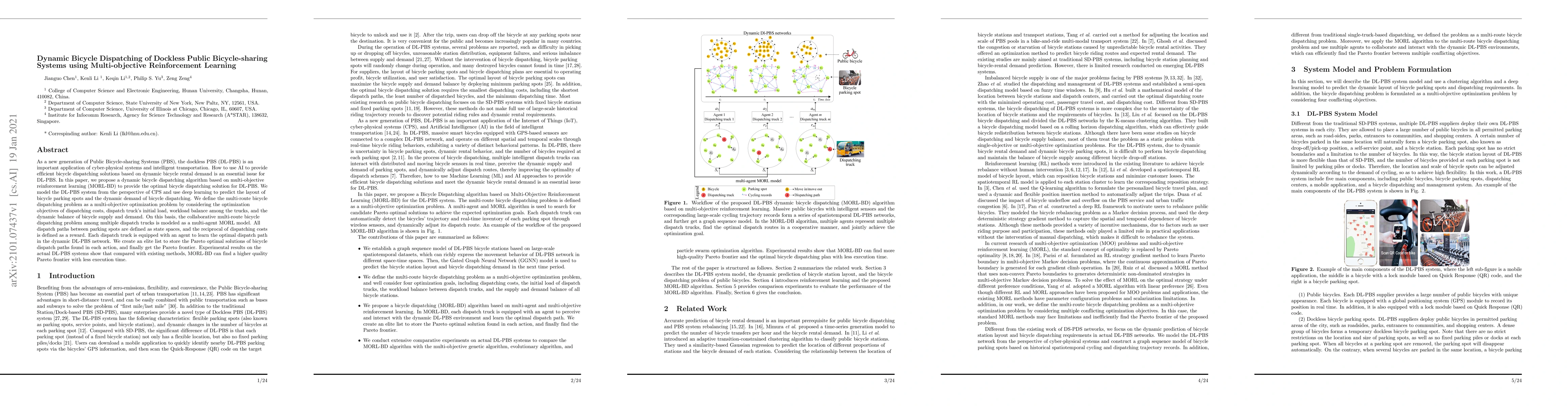 This paper proposes a multi-objective reinforcement learning algorithm (MORL-BD) for dynamic bicycle dispatching in dockless public bicycle-sharing systems. The approach optimizes dispatching costs, initial load, workload balance, and supply-demand dynamics, achieving higher quality Pareto frontiers compared to existing methods.