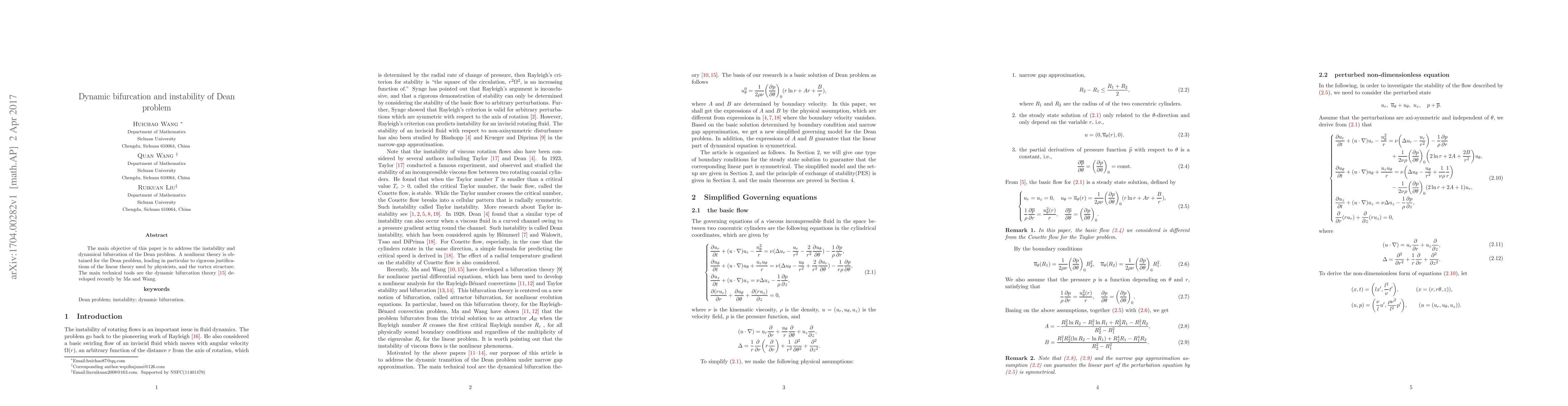 This paper investigates the instability and dynamical bifurcation in the Dean problem using a nonlinear theory, providing rigorous justifications for the linear theory and vortex structure traditionally employed. The study leverages dynamic bifurcation theory developed by Ma and Wang to achieve these insights.