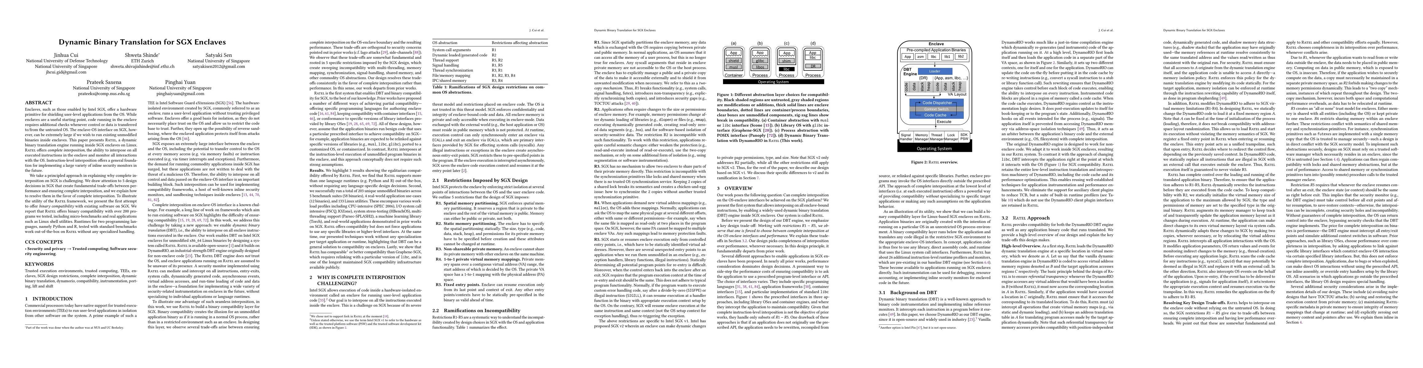 This paper introduces Ratel, a dynamic binary translation engine for Intel SGX enclaves, enabling interposition on all executed instructions to monitor interactions with the untrusted OS. It addresses design challenges in SGX to achieve complete interposition, demonstrating compatibility with over 200 programs and out-of-the-box support for Python and R runtimes.