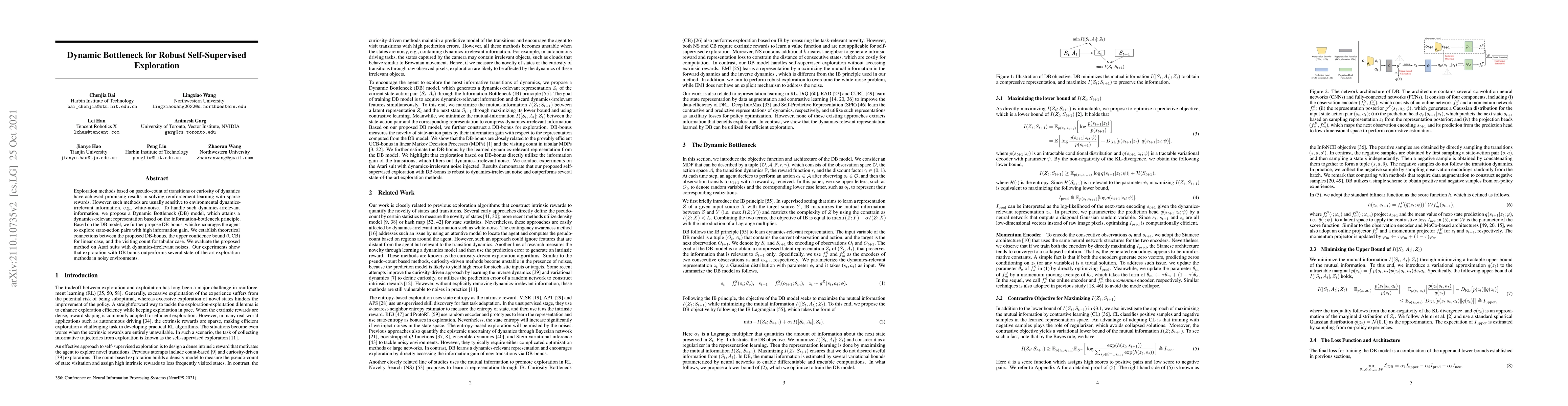 The paper proposes a Dynamic Bottleneck (DB) model to create a dynamics-relevant representation for self-supervised exploration in reinforcement learning, addressing sensitivity to irrelevant information. The DB-bonus method, based on the DB model, enhances exploration by prioritizing high information gain state-action pairs, outperforming other methods in noisy environments.