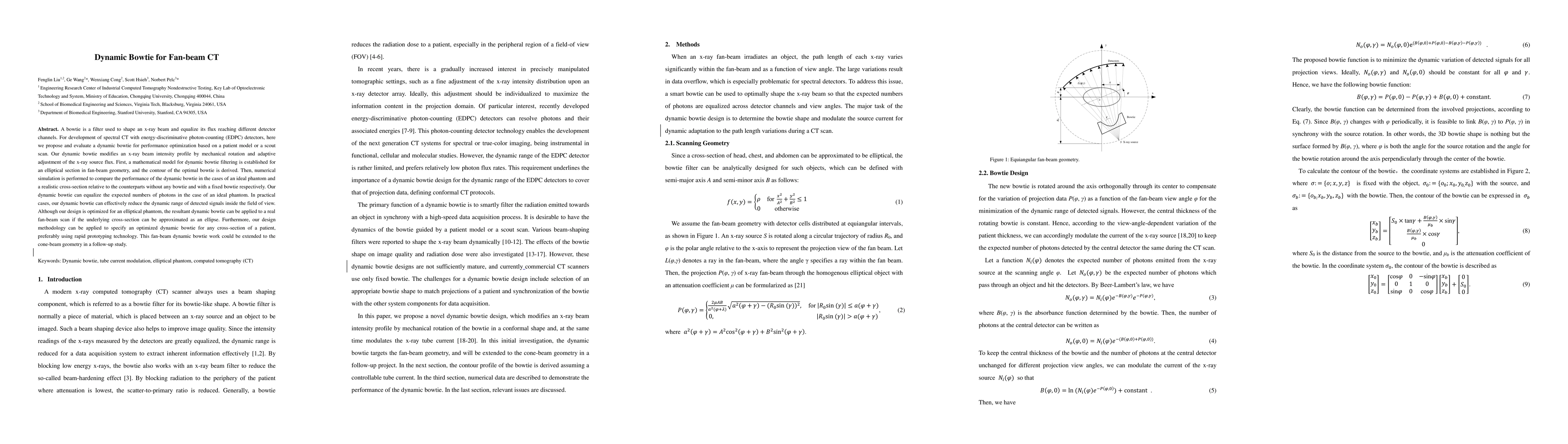 A bowtie is a filter used to shape an x-ray beam and equalize its flux reaching different detector channels. For development of spectral CT with energy-discriminative photon-counting (EDPC) detectors, here we propose and evaluate a dynamic bowtie for performance optimization based on a patient model or a scout scan. Our dynamic bowtie modifies an x-ray beam intensity profile by mechanical rotation and adaptive adjustment of the x-ray source flux. First, a mathematical model for dynamic bowtie filtering is established for an elliptical section in fan-beam geometry, and the contour of the optimal bowtie is derived. Then, numerical simulation is performed to compare the performance of the dynamic bowtie in the cases of an ideal phantom and a realistic cross-section relative to the counterparts without any bowtie and with a fixed bowtie respectively. Our dynamic bowtie can equalize the expected numbers of photons in the case of an ideal phantom. In practical cases, our dynamic bowtie can effectively reduce the dynamic range of detected signals inside the field of view. Although our design is optimized for an elliptical phantom, the resultant dynamic bowtie can be applied to a real fan-beam scan if the underlying cross-section can be approximated as an ellipse. Furthermore, our design methodology can be applied to specify an optimized dynamic bowtie for any cross-section of a patient, preferably using rapid prototyping technology. This fan-beam dynamic bowtie work could be extended to the cone-beam geometry in a follow-up study.