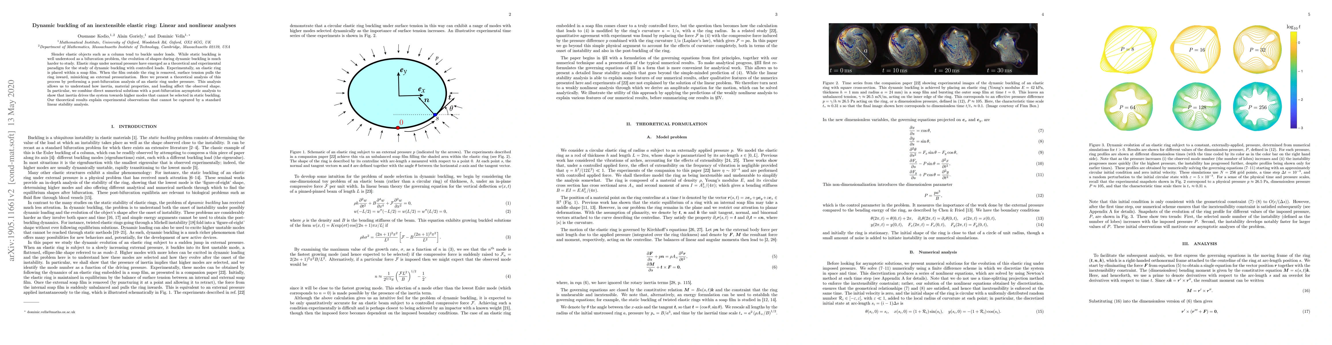 Slender elastic objects such as a column tend to buckle under loads. While static buckling is well understood as a bifurcation problem, the evolution of shapes during dynamic buckling is much harder to study. Elastic rings under normal pressure have emerged as a theoretical and experimental paradigm for the study of dynamic buckling with controlled loads. Experimentally, an elastic ring is placed within a soap film. When the film outside the ring is removed, surface tension pulls the ring inward, mimicking an external pressurization. Here we present a theoretical analysis of this process by performing a post-bifurcation analysis of an elastic ring under pressure. This analysis allows us to understand how inertia, material properties, and loading affect the observed shape. In particular, we combine direct numerical solutions with a post-bifurcation asymptotic analysis to show that inertia drives the system towards higher modes that cannot be selected in static buckling. Our theoretical results explain experimental observations that cannot be captured by a standard linear stability analysis.