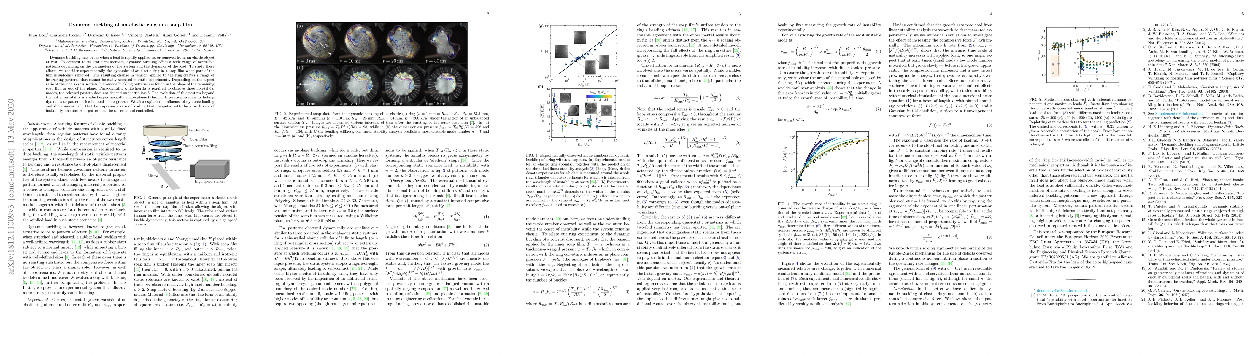 This paper investigates dynamic buckling patterns in elastic rings on a soap film when part of the film is rapidly removed, revealing complex, non-trivial buckling modes dependent on the ring's aspect ratio and dynamic loading rates. The study combines experimental observations and theoretical explanations to demonstrate how pattern selection and growth are influenced by dynamic factors.