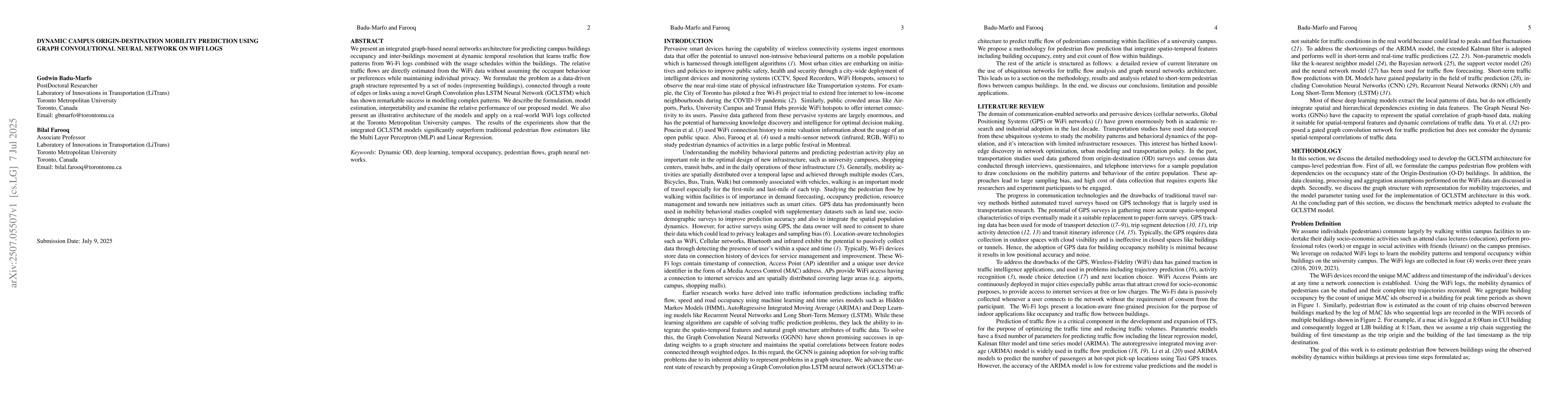 We present an integrated graph-based neural networks architecture for predicting campus buildings occupancy and inter-buildings movement at dynamic temporal resolution that learns traffic flow patterns from Wi-Fi logs combined with the usage schedules within the buildings. The relative traffic flows are directly estimated from the WiFi data without assuming the occupant behaviour or preferences while maintaining individual privacy. We formulate the problem as a data-driven graph structure represented by a set of nodes (representing buildings), connected through a route of edges or links using a novel Graph Convolution plus LSTM Neural Network (GCLSTM) which has shown remarkable success in modelling complex patterns. We describe the formulation, model estimation, interpretability and examine the relative performance of our proposed model. We also present an illustrative architecture of the models and apply on real-world WiFi logs collected at the Toronto Metropolitan University campus. The results of the experiments show that the integrated GCLSTM models significantly outperform traditional pedestrian flow estimators like the Multi Layer Perceptron (MLP) and Linear Regression.