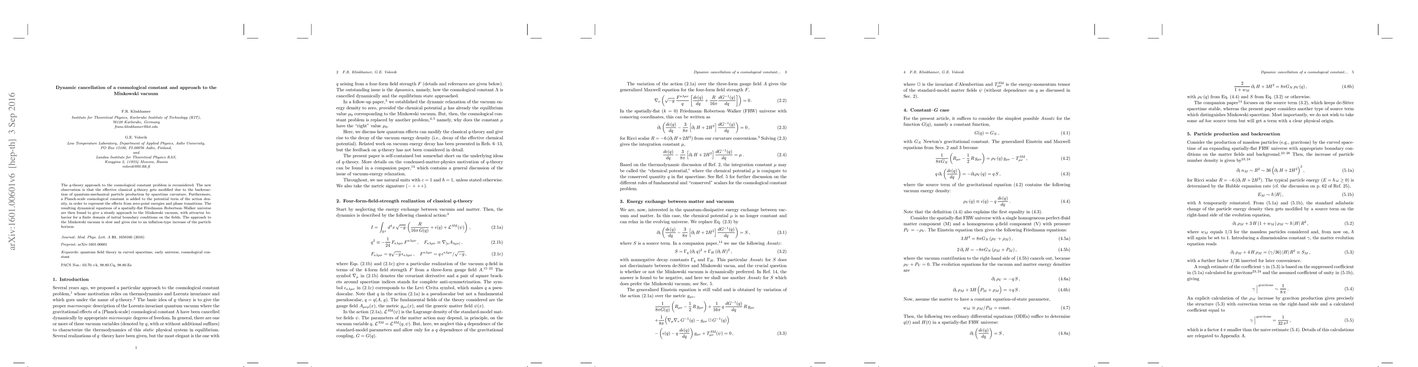 The $q$-theory approach to the cosmological constant problem is reconsidered. The new observation is that the effective classical $q$-theory gets modified due to the backreaction of quantum-mechanical particle production by spacetime curvature. Furthermore, a Planck-scale cosmological constant is added to the potential term of the action density, in order to represent the effects from zero-point energies and phase transitions. The resulting dynamical equations of a spatially-flat Friedmann-Robertson-Walker universe are then found to give a steady approach to the Minkowski vacuum, with attractor behavior for a finite domain of initial boundary conditions on the fields. The approach to the Minkowski vacuum is slow and gives rise to an inflation-type increase of the particle horizon.