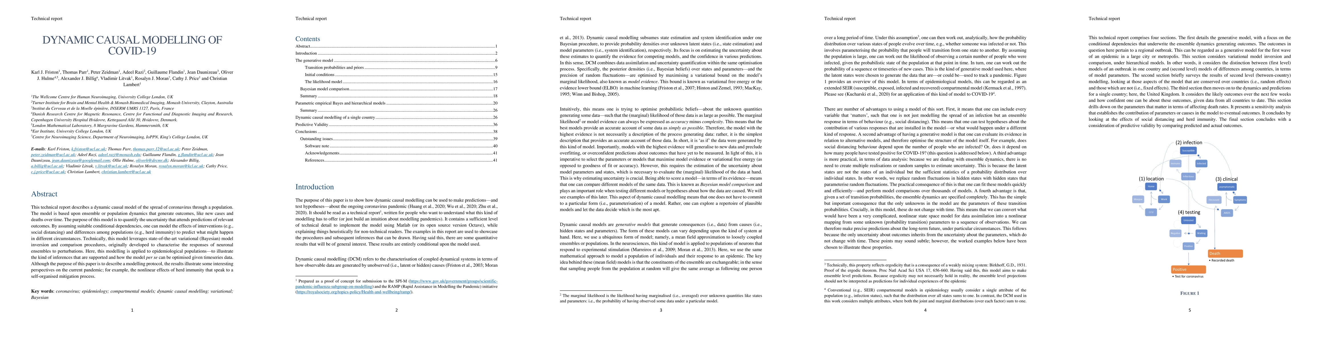 This technical report describes a dynamic causal model of the spread of coronavirus through a population. The model is based upon ensemble or population dynamics that generate outcomes, like new cases and deaths over time. The purpose of this model is to quantify the uncertainty that attends predictions of relevant outcomes. By assuming suitable conditional dependencies, one can model the effects of interventions (e.g., social distancing) and differences among populations (e.g., herd immunity) to predict what might happen in different circumstances. Technically, this model leverages state-of-the-art variational (Bayesian) model inversion and comparison procedures, originally developed to characterise the responses of neuronal ensembles to perturbations. Here, this modelling is applied to epidemiological populations to illustrate the kind of inferences that are supported and how the model per se can be optimised given timeseries data. Although the purpose of this paper is to describe a modelling protocol, the results illustrate some interesting perspectives on the current pandemic; for example, the nonlinear effects of herd immunity that speak to a self-organised mitigation process.