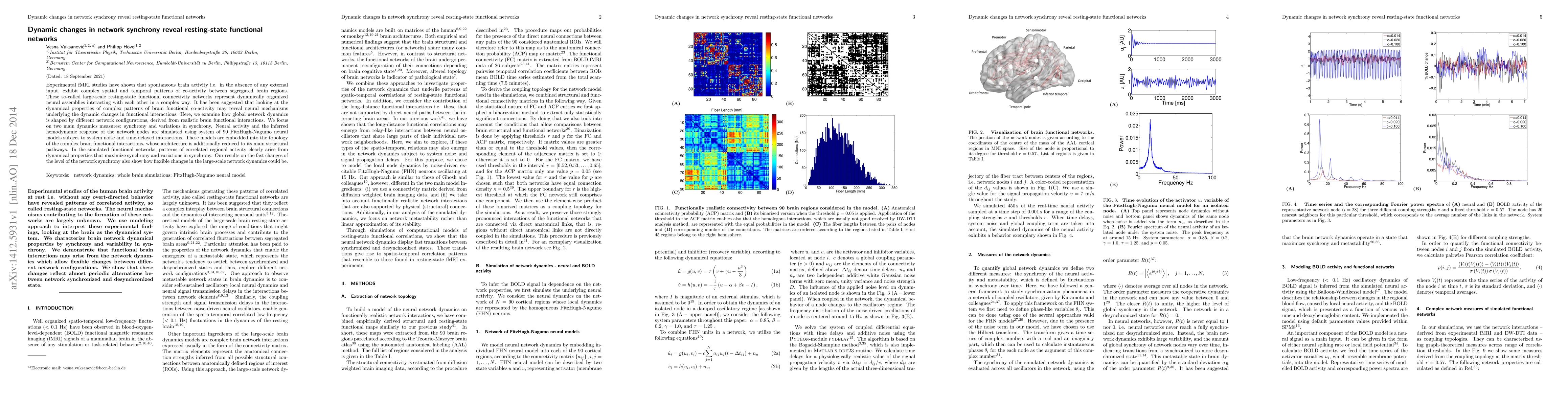 Experimental fMRI studies have shown that spontaneous brain activity i.e. in the absence of any external input, exhibit complex spatial and temporal patterns of co-activity between segregated brain regions. These so-called large-scale resting-state functional connectivity networks represent dynamically organized neural assemblies interacting with each other in a complex way. It has been suggested that looking at the dynamical properties of complex patterns of brain functional co-activity may reveal neural mechanisms underlying the dynamic changes in functional interactions. Here, we examine how global network dynamics is shaped by different network configurations, derived from realistic brain functional interactions. We focus on two main dynamics measures: synchrony and variations in synchrony. Neural activity and the inferred hemodynamic response of the network nodes are simulated using system of 90 FitzHugh-Nagumo neural models subject to system noise and time-delayed interactions. These models are embedded into the topology of the complex brain functional interactions, whose architecture is additionally reduced to its main structural pathways. In the simulated functional networks, patterns of correlated regional activity clearly arise from dynamical properties that maximize synchrony and variations in synchrony. Our results on the fast changes of the level of the network synchrony also show how flexible changes in the large-scale network dynamics could be.