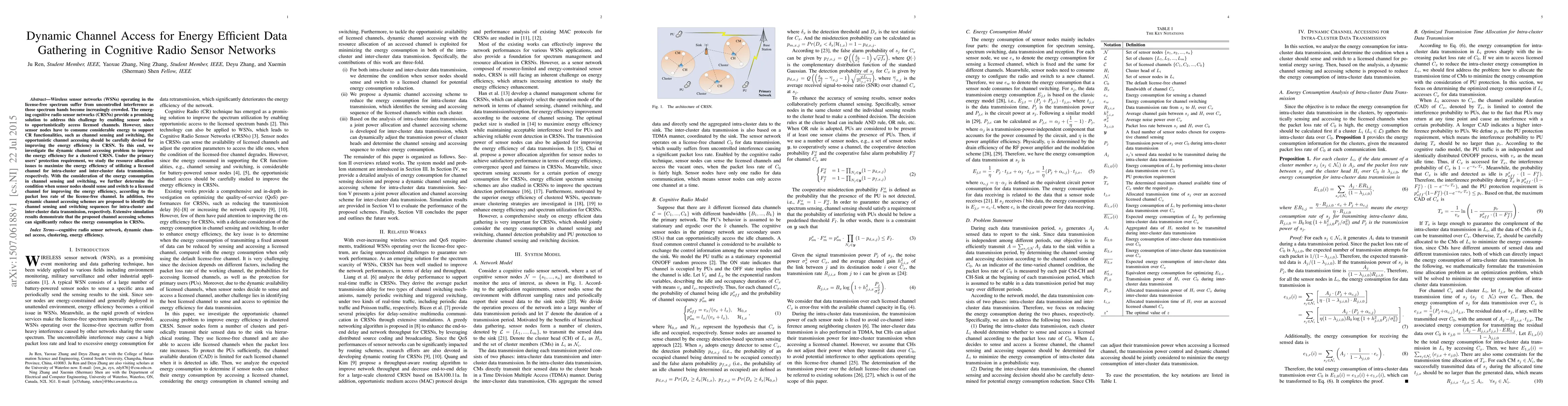 This paper investigates dynamic channel access strategies for cognitive radio sensor networks (CRSNs) to enhance energy efficiency amidst interference in crowded, license-free spectrum. It proposes two schemes to optimize channel sensing and switching, balancing primary user protection with energy savings, and demonstrates significant reductions in energy consumption through simulations.