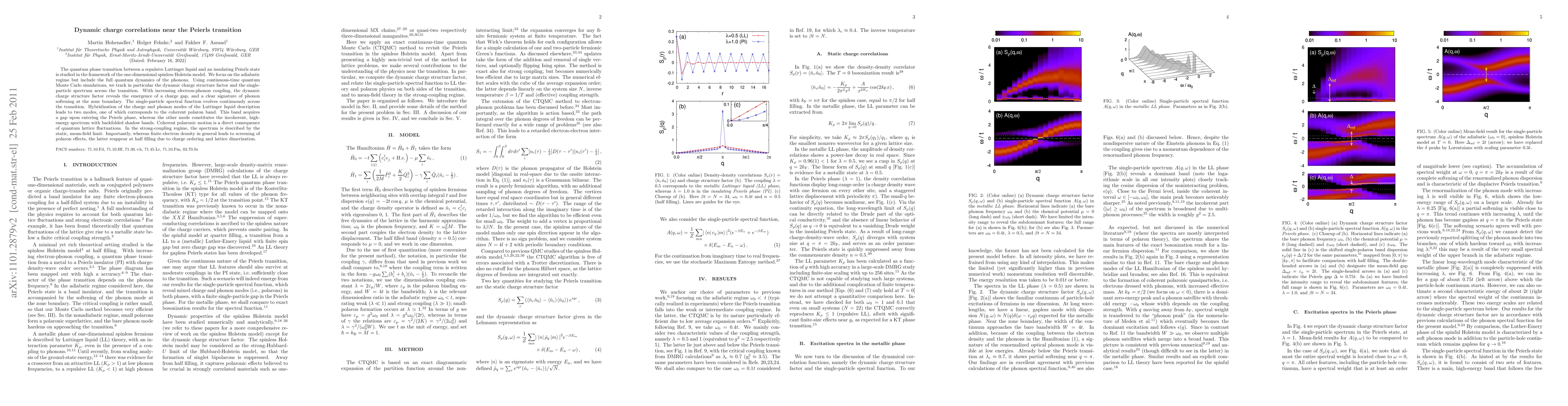 The quantum phase transition between a repulsive Luttinger liquid and an insulating Peierls state is studied in the framework of the one-dimensional spinless Holstein model. We focus on the adiabatic regime but include the full quantum dynamics of the phonons. Using continuous-time quantum Monte Carlo simulations, we track in particular the dynamic charge structure factor and the single-particle spectrum across the transition. With increasing electron-phonon coupling, the dynamic charge structure factor reveals the emergence of a charge gap, and a clear signature of phonon softening at the zone boundary. The single-particle spectral function evolves continuously across the transition. Hybridization of the charge and phonon modes of the Luttinger liquid description leads to two modes, one of which corresponds to the coherent polaron band. This band acquires a gap upon entering the Peierls phase, whereas the other mode constitutes the incoherent, high-energy spectrum with backfolded shadow bands. Coherent polaronic motion is a direct consequence of quantum lattice fluctuations. In the strong-coupling regime, the spectrum is described by the static, mean-field limit. Importantly, whereas finite electron density in general leads to screening of polaron effects, the latter reappear at half filling due to charge ordering and lattice dimerization.