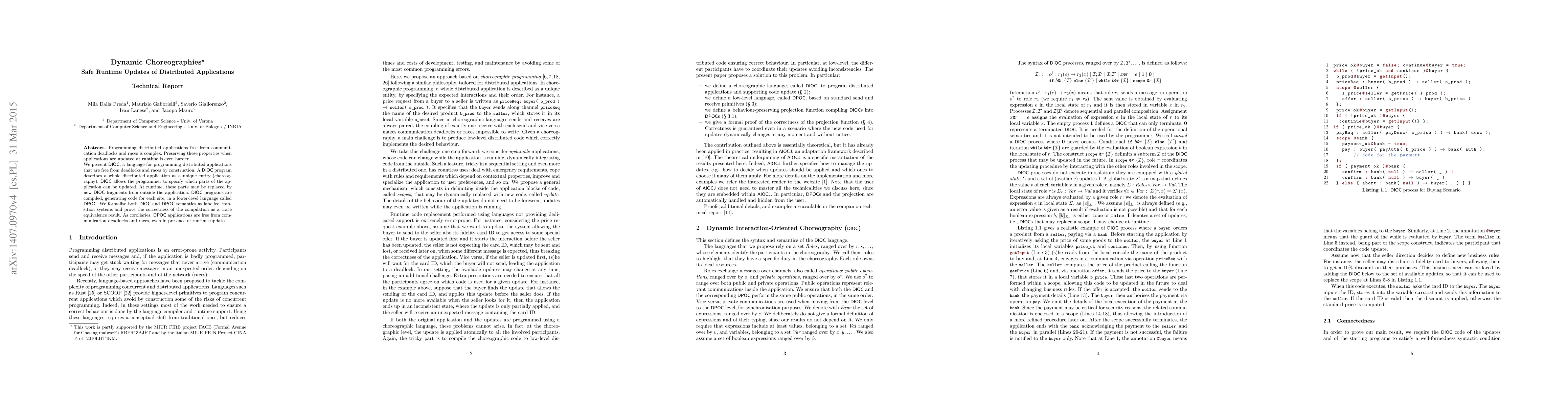Programming distributed applications free from communication deadlocks and races is complex. Preserving these properties when applications are updated at runtime is even harder. We present DIOC, a language for programming distributed applications that are free from deadlocks and races by construction. A DIOC program describes a whole distributed application as a unique entity (choreography). DIOC allows the programmer to specify which parts of the application can be updated. At runtime, these parts may be replaced by new DIOC fragments from outside the application. DIOC programs are compiled, generating code for each site, in a lower-level language called DPOC. We formalise both DIOC and DPOC semantics as labelled transition systems and prove the correctness of the compilation as a trace equivalence result. As corollaries, DPOC applications are free from communication deadlocks and races, even in presence of runtime updates.