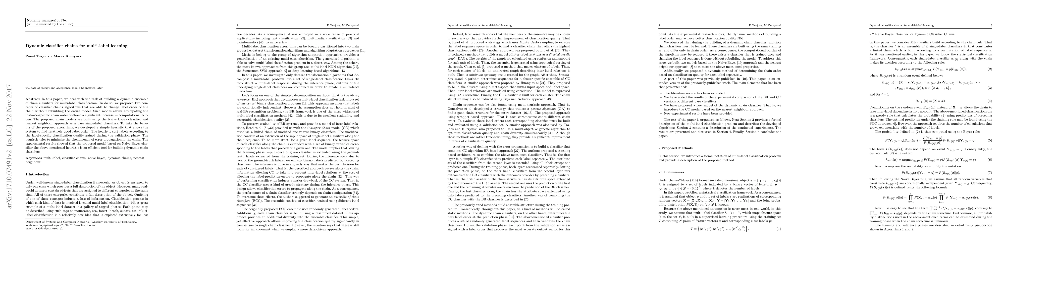 In this paper, we deal with the task of building a dynamic ensemble of chain classifiers for multi-label classification. To do so, we proposed two concepts of classifier chains algorithms that are able to change label order of the chain without rebuilding the entire model. Such modes allows anticipating the instance-specific chain order without a significant increase in computational burden. The proposed chain models are built using the Naive Bayes classifier and nearest neighbour approach as a base single-label classifiers. To take the benefits of the proposed algorithms, we developed a simple heuristic that allows the system to find relatively good label order. The heuristic sort labels according to the label-specific classification quality gained during the validation phase. The heuristic tries to minimise the phenomenon of error propagation in the chain. The experimental results showed that the proposed model based on Naive Bayes classifier the above-mentioned heuristic is an efficient tool for building dynamic chain classifiers.