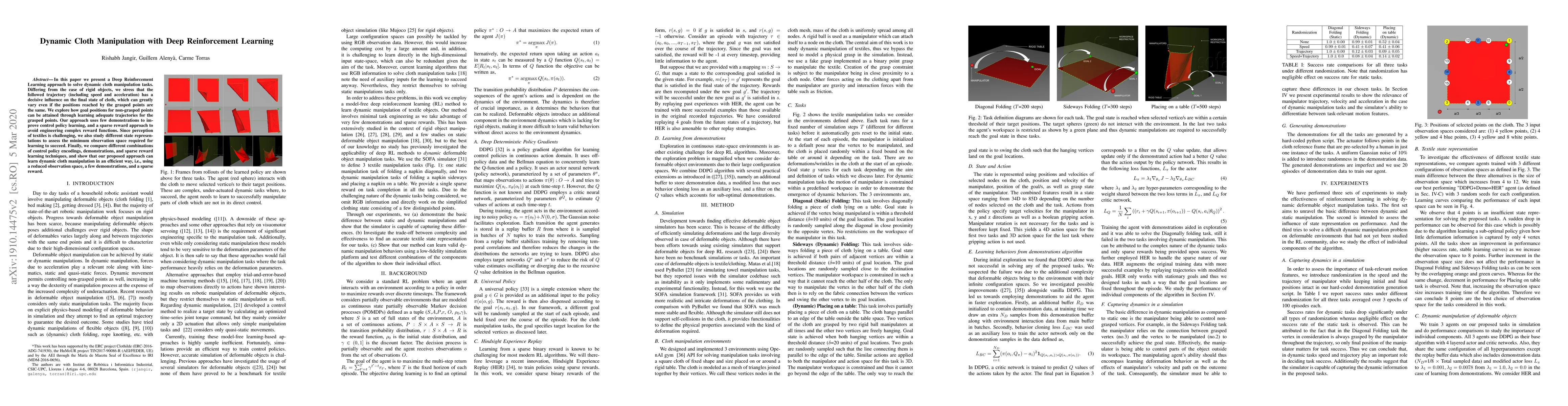 This paper proposes a Deep Reinforcement Learning method for dynamic cloth manipulation, emphasizing the importance of trajectory over final position. It uses few demonstrations and sparse rewards to efficiently learn the control policy, exploring various state representations to determine the minimal observation space needed for successful learning.