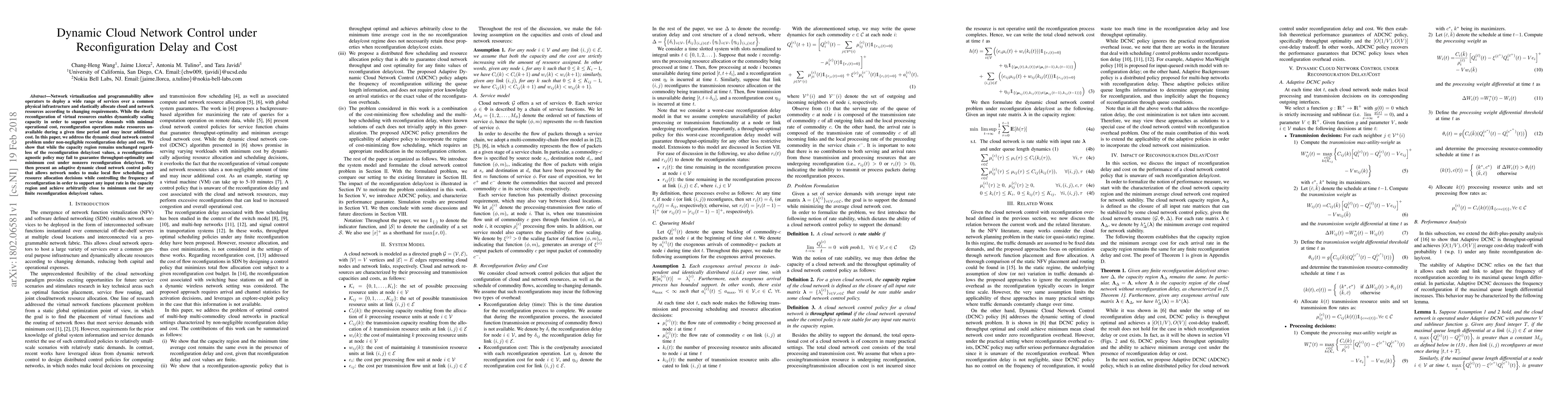 This paper proposes an adaptive dynamic cloud network control policy to manage resource allocation and flow scheduling under non-zero reconfiguration delays and costs, ensuring throughput-optimality and minimum cost despite reconfiguration-induced resource unavailability. The policy allows local decisions while controlling reconfiguration frequency to achieve near-optimal performance.