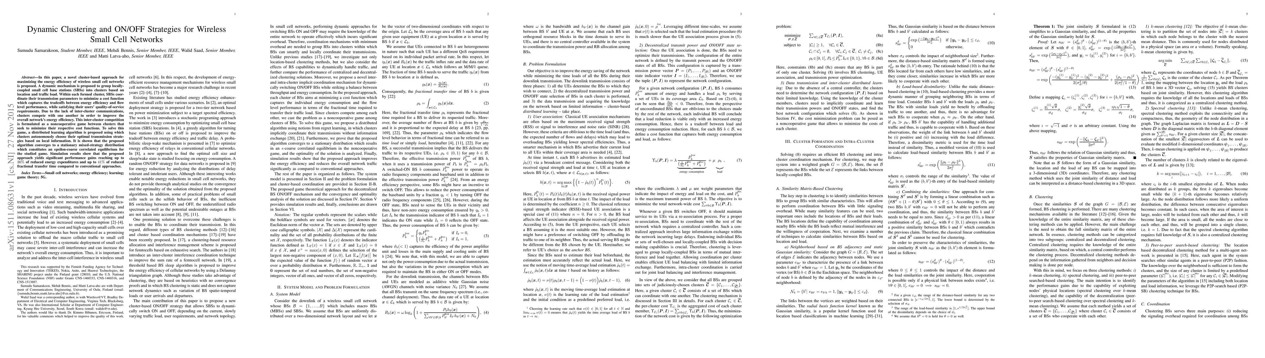 This paper proposes a dynamic clustering and ON/OFF strategy to enhance energy efficiency in wireless small cell networks. It employs a cluster-based approach where small cell base stations coordinate to minimize energy-performance tradeoffs while satisfying user QoS, leveraging a noncooperative game and distributed learning algorithm to achieve optimal transmission strategies.
