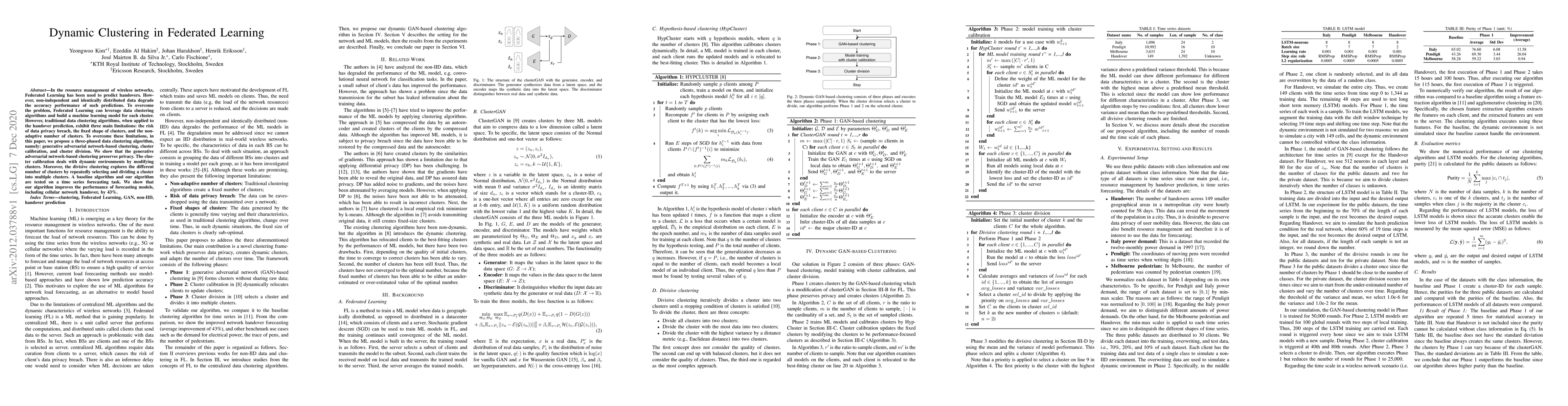 In the resource management of wireless networks, Federated Learning has been used to predict handovers. However, non-independent and identically distributed data degrade the accuracy performance of such predictions. To overcome the problem, Federated Learning can leverage data clustering algorithms and build a machine learning model for each cluster. However, traditional data clustering algorithms, when applied to the handover prediction, exhibit three main limitations: the risk of data privacy breach, the fixed shape of clusters, and the non-adaptive number of clusters. To overcome these limitations, in this paper, we propose a three-phased data clustering algorithm, namely: generative adversarial network-based clustering, cluster calibration, and cluster division. We show that the generative adversarial network-based clustering preserves privacy. The cluster calibration deals with dynamic environments by modifying clusters. Moreover, the divisive clustering explores the different number of clusters by repeatedly selecting and dividing a cluster into multiple clusters. A baseline algorithm and our algorithm are tested on a time series forecasting task. We show that our algorithm improves the performance of forecasting models, including cellular network handover, by 43%.