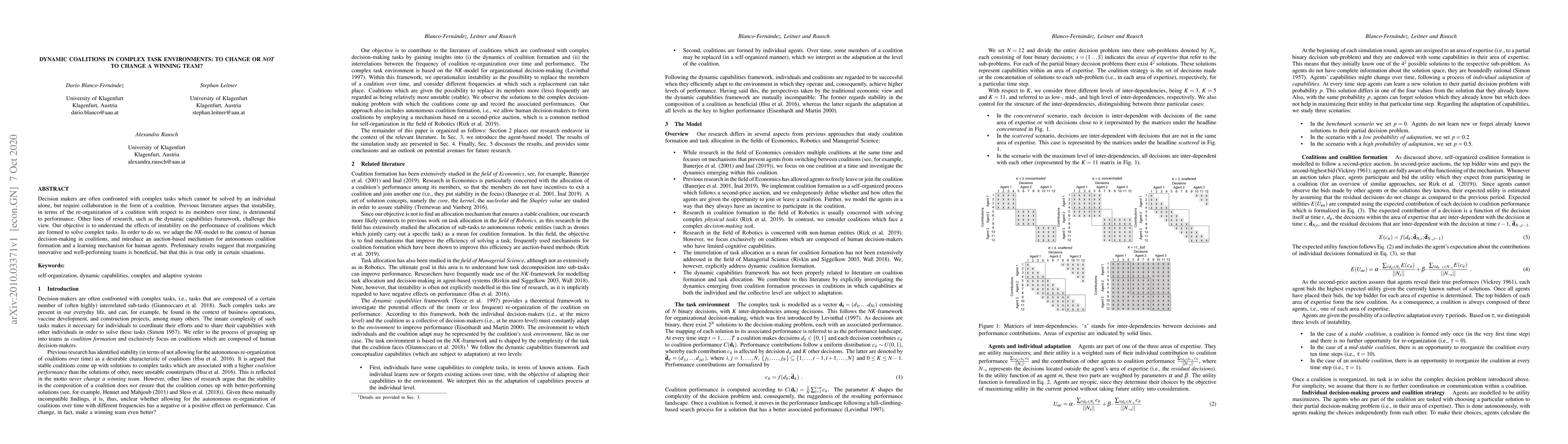 Decision makers are often confronted with complex tasks which cannot be solved by an individual alone, but require collaboration in the form of a coalition. Previous literature argues that instability, in terms of the re-organization of a coalition with respect to its members over time, is detrimental to performance. Other lines of research, such as the dynamic capabilities framework, challenge this view. Our objective is to understand the effects of instability on the performance of coalitions which are formed to solve complex tasks. In order to do so, we adapt the NK-model to the context of human decision-making in coalitions, and introduce an auction-based mechanism for autonomous coalition formation and a learning mechanism for human agents. Preliminary results suggest that re-organizing innovative and well-performing teams is beneficial, but that this is true only in certain situations.