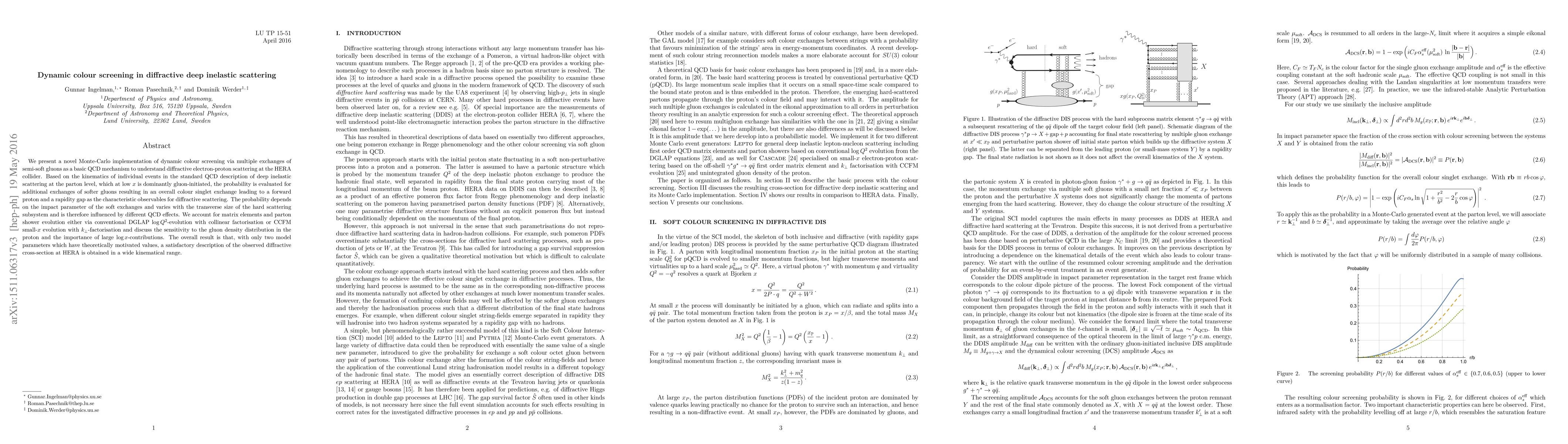 This paper introduces a Monte-Carlo model for dynamic colour screening in diffractive deep inelastic scattering at the HERA collider, focusing on multiple exchanges of semi-soft gluons. The model successfully describes the observed diffractive cross-section using two theoretically motivated parameters, highlighting the importance of QCD effects and gluon density distribution.