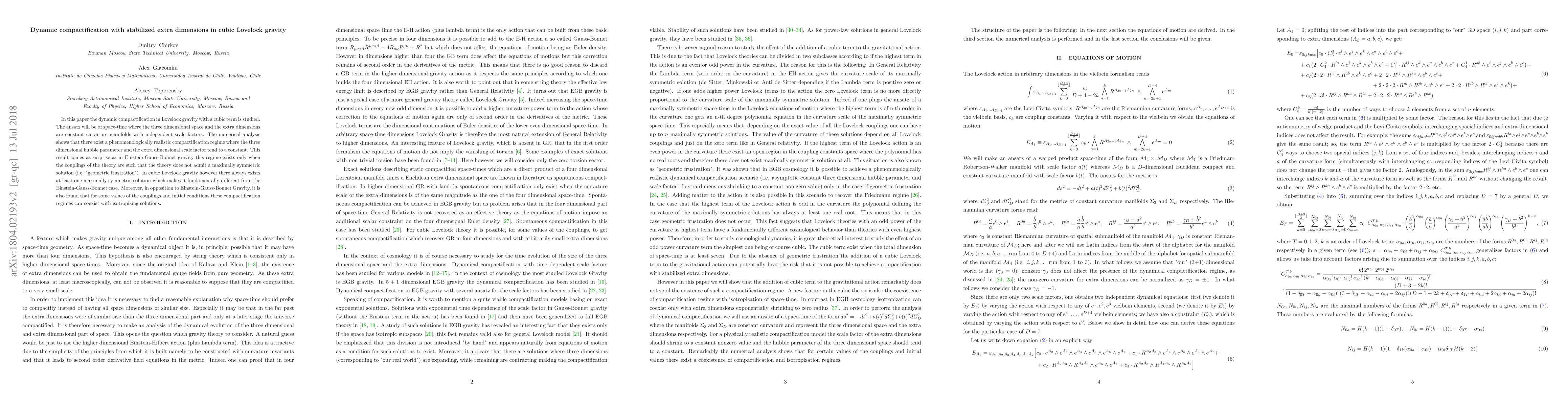 In this paper the dynamic compactification in Lovelock gravity with a cubic term is studied. The ansatz will be of space-time where the three dimensional space and the extra dimensions are constant curvature manifolds with independent scale factors. The numerical analysis shows that there exist a phenomenologically realistic compactification regime where the three dimensional hubble parameter and the extra dimensional scale factor tend to a constant. This result comes as surprise as in Einstein-Gauss-Bonnet gravity this regime exists only when the couplings of the theory are such that the theory does not admit a maximally symmetric solution (i.e. "geometric frustration"). In cubic Lovelock gravity however there always exists at least one maximally symmetric solution which makes it fundamentally different from the Einstein-Gauss-Bonnet case. Moreover, in opposition to Einstein-Gauss-Bonnet Gravity, it is also found that for some values of the couplings and initial conditions these compactification regimes can coexist with isotropizing solutions.