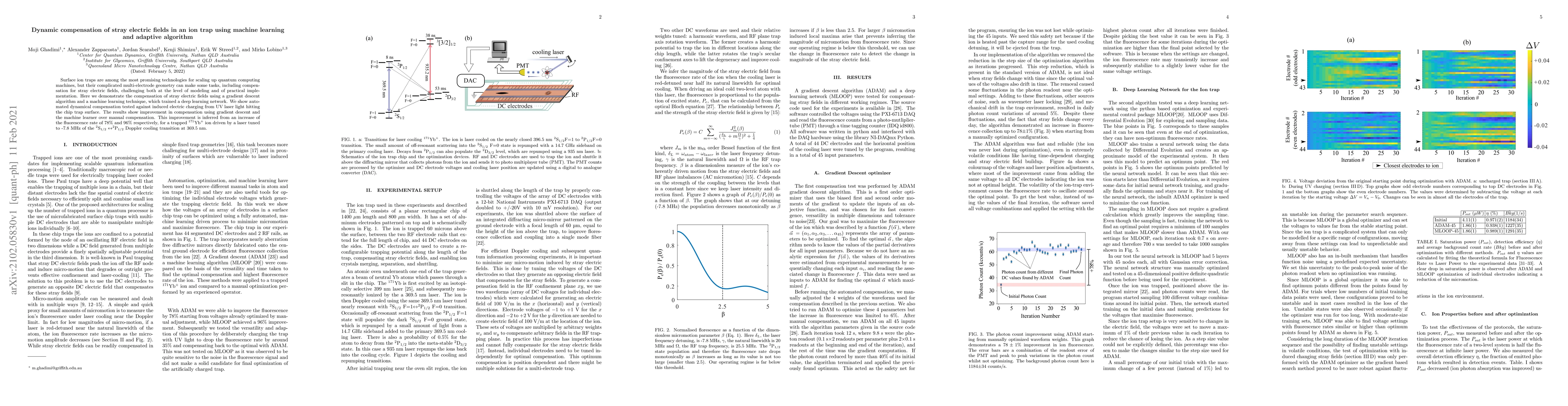 This paper presents a method for dynamic compensation of stray electric fields in surface ion traps using a gradient descent algorithm and machine learning, showing a 78% improvement in fluorescence rate over manual compensation. The technique was tested against electric charging induced by UV laser light.